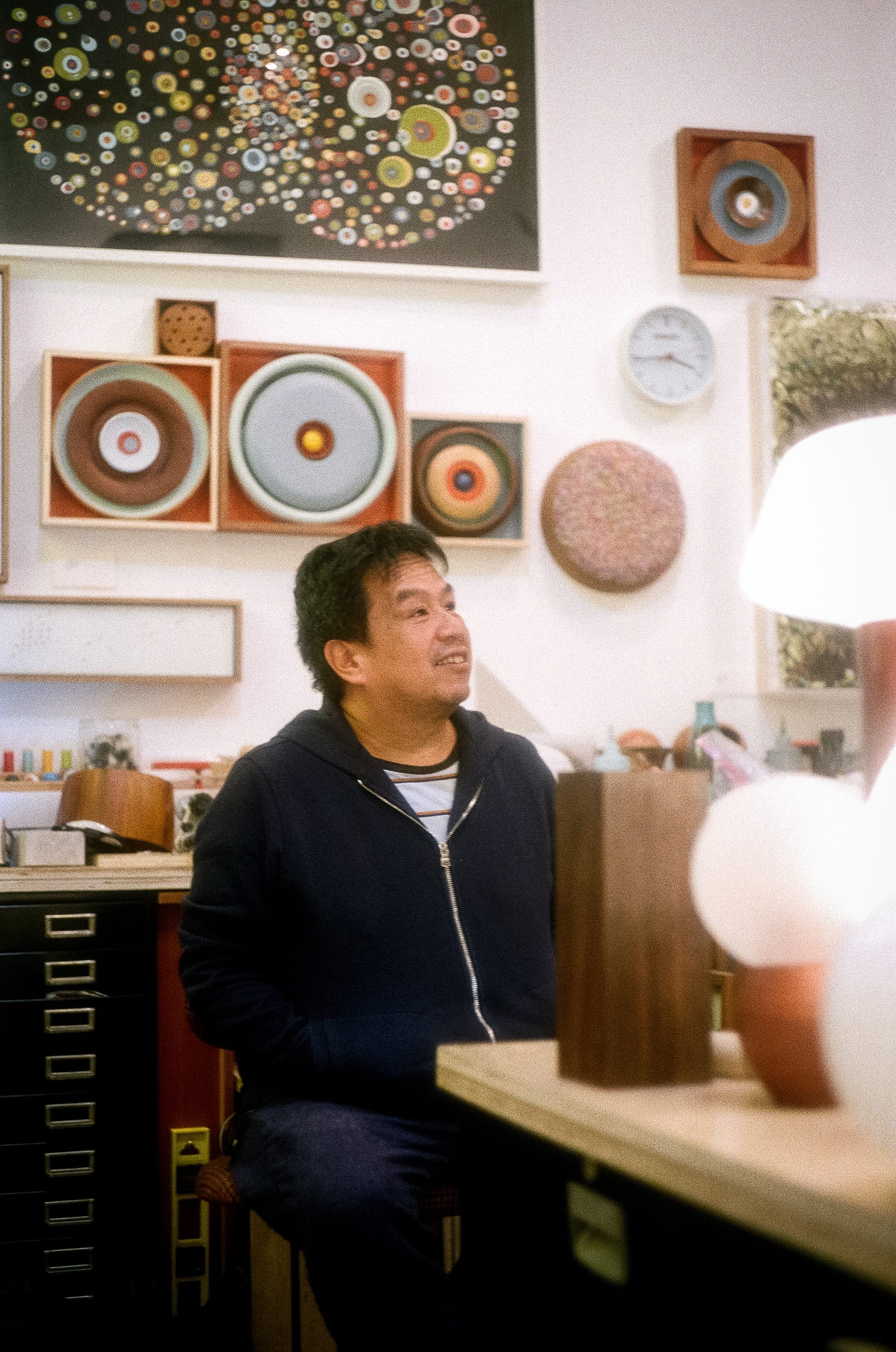 As Truong Tran moves around his studio, pulling cords and flipping switches, his art lights up — almost every piece is illuminated. His work is often built around hidden images or words. After he noticed that visitors kept taking selfies of themselves with his work, he made a “selfie mirror.” Stare into the mirror long enough, and a poem hidden behind it reveals itself: