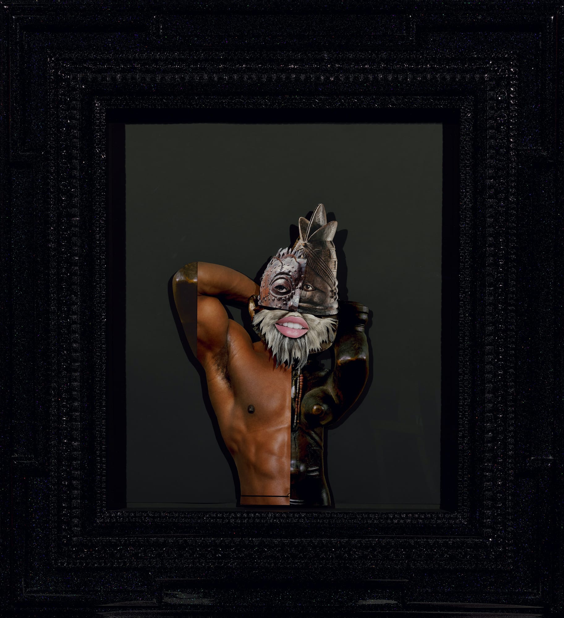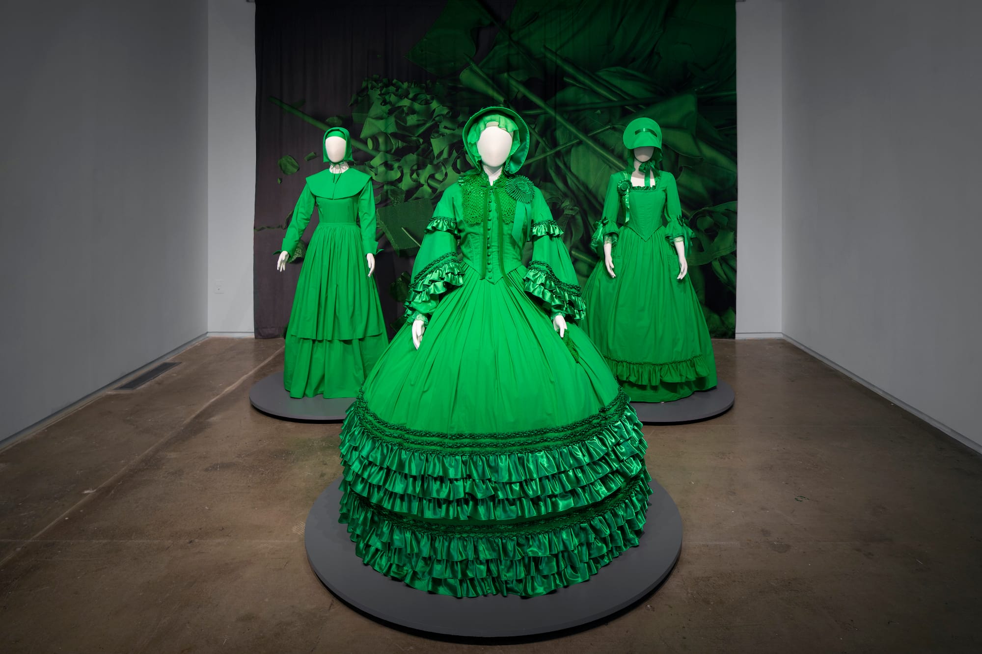 The recently acquired works include videos by Cristóbal Martínez and Ana Teresa Fernández, sculpture by Guillermo Galindo and Sahar Khoury, ceramics by Ruby Neri, and collage by Rashaad Newsome. Some pieces combine different media, such as Stephanie Syjuco’s “The Visible Invisible: Plymouth Pilgrim, Antebellum South, Colonial Revolution” (2018), featuring three dresses fabricated entirely out of green "chroma key" backdrop fabric that can be superimposed with new patterns.