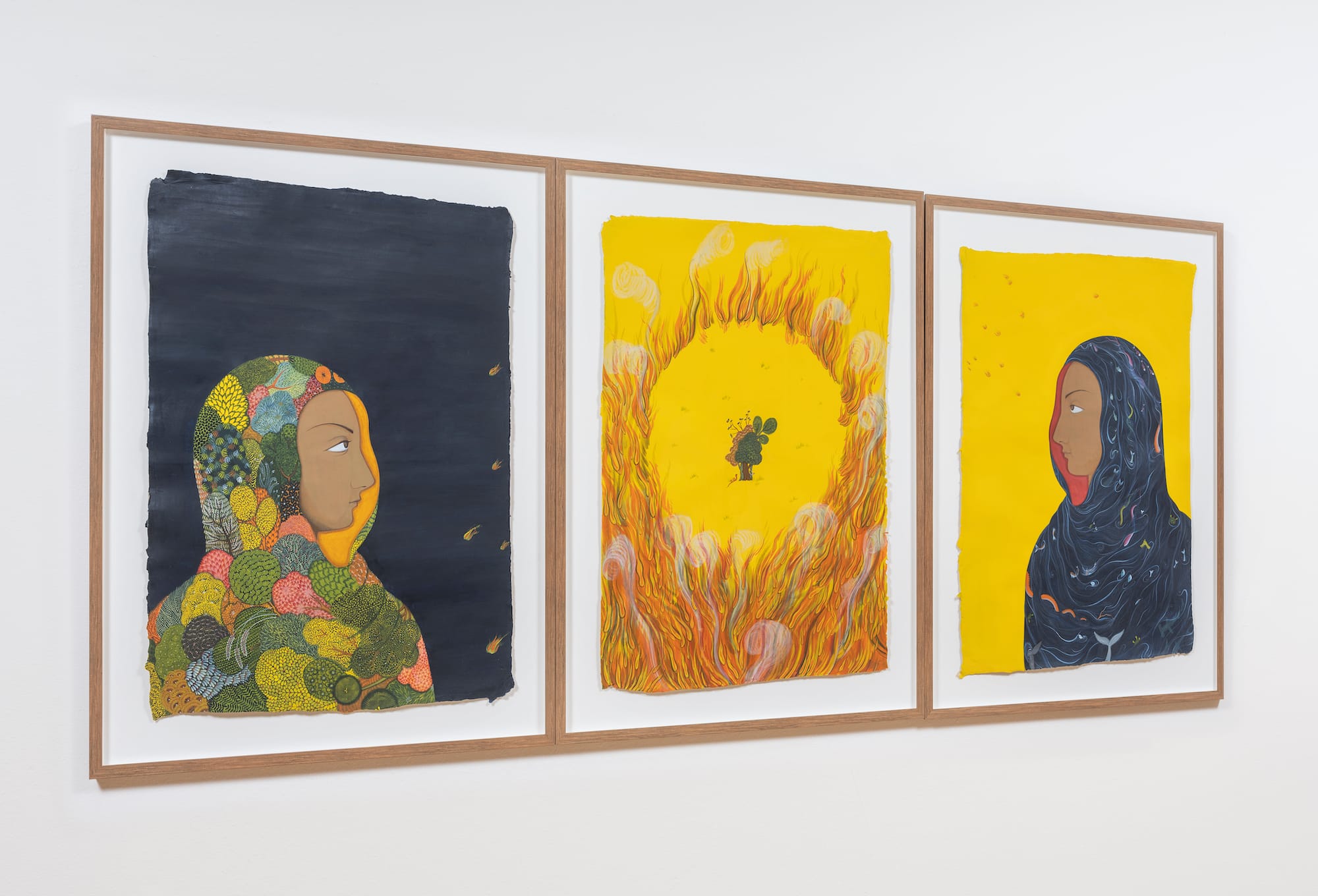 Tut expressed a similar sentiment about the acquisition of her triptych “A New Normal.” Each side of the work shows a woman wearing a scarf, one representing the forest and the other the ocean. Both are gazing toward the middle painting of a tree surrounded by fire with snakes twined around it, representing an unloved creature, ignored during a crisis. Anger was the driving emotion behind that painting, which directly addresses climate change, Tut said. She was moved by others’ reactions to the acquisition.