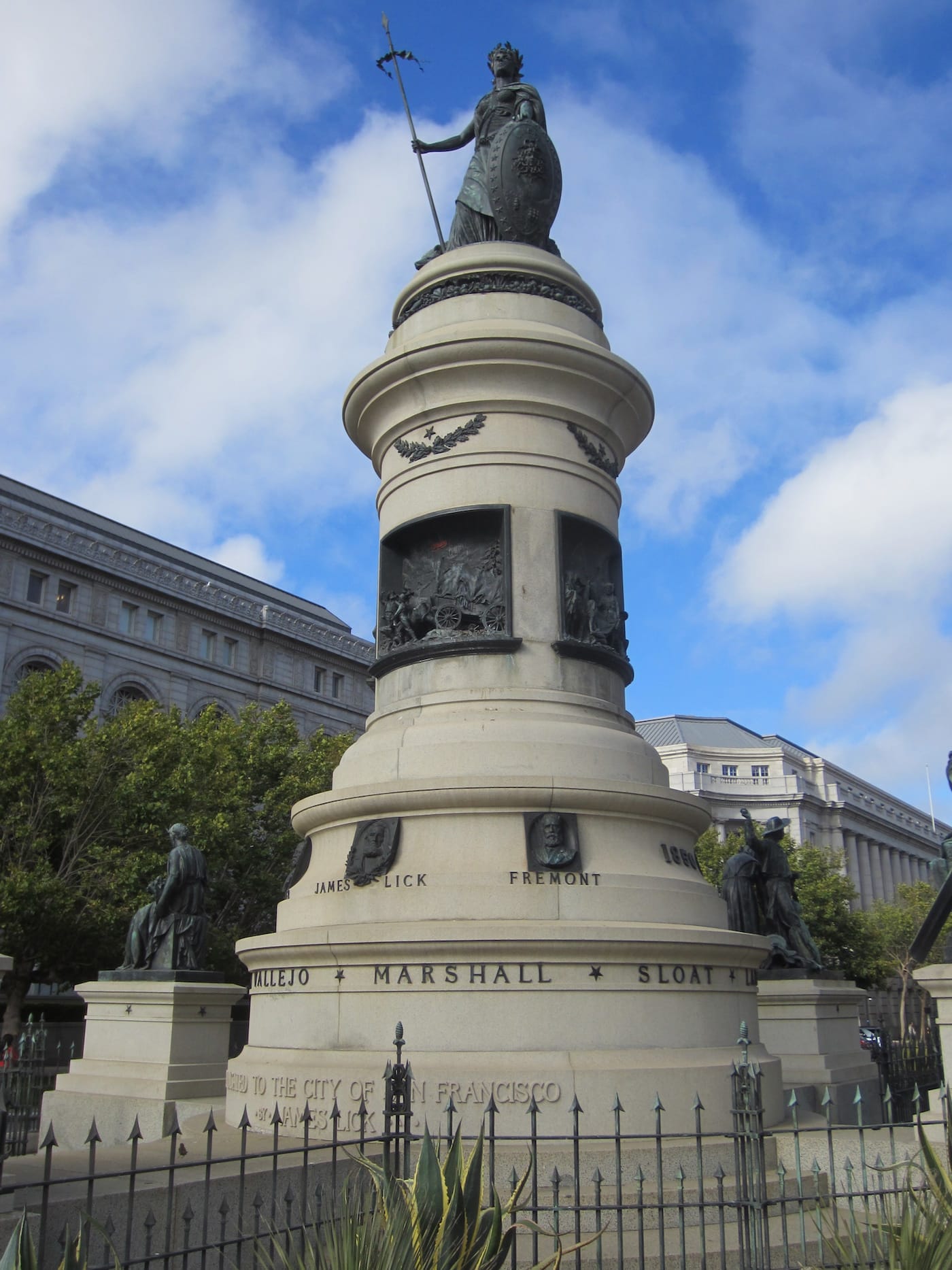 Originally located around the corner from its current site, Pioneer Monument was funded by the estate of local businessman James Lick, who died in 1876 as the wealthiest man in California. The historical scenes were created by Frank Happersberger to encircle a large figure of Athena. “Early Days” was one of four sculptures near the base of the monument; the others represented allegories of Commerce and Plenty, as well as a group of miners to commemorate the California Gold Rush (which itself displaced many indigenous people). The city moved the monument to its current position to make way for the construction of the San Francisco Public Library.