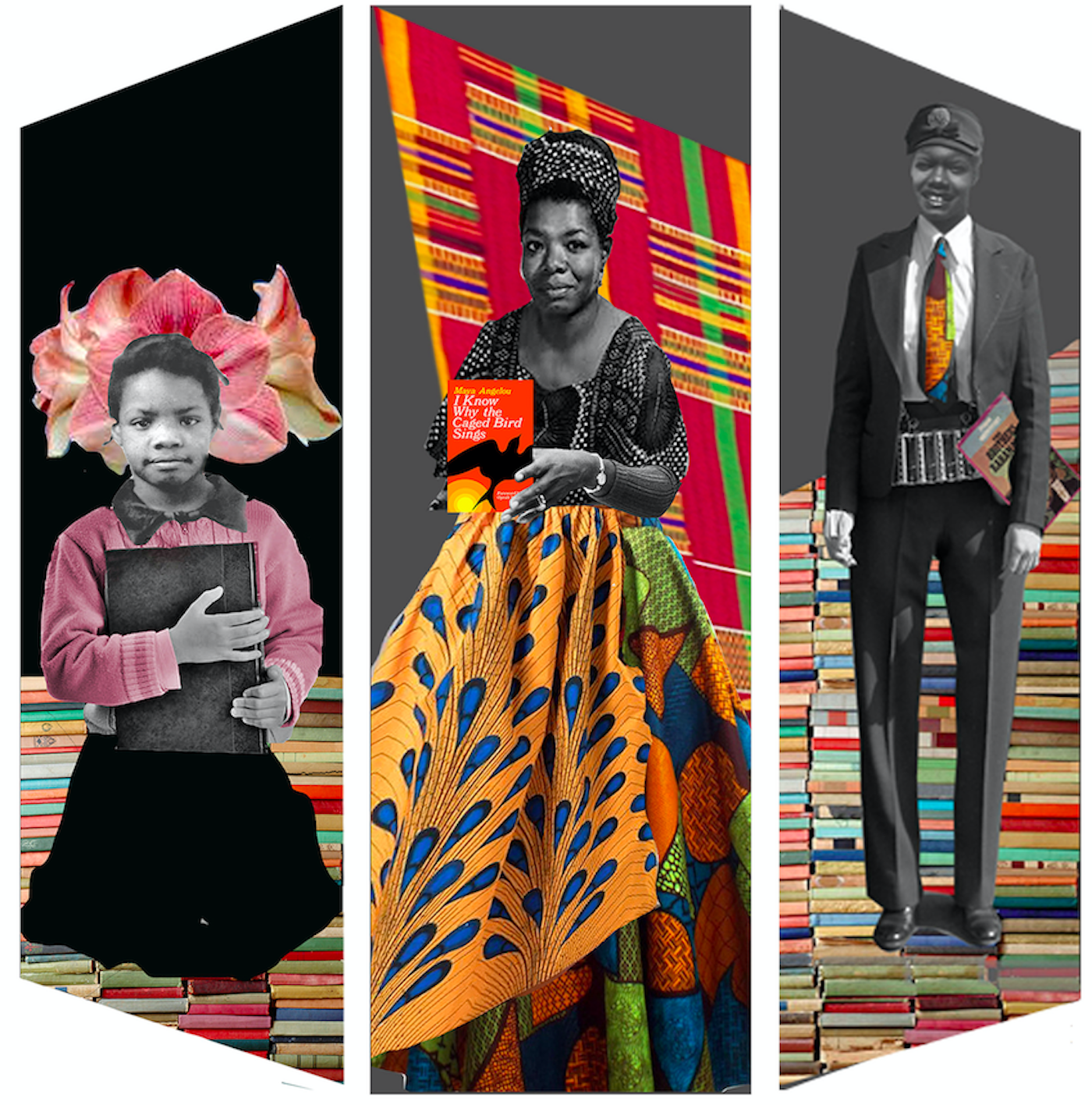 The bronze statue features Angelou as a young girl standing with one leg atop a birdcage and a stack of books. One arm and one leg are outstretched as if the young author is about to take flight while her nose is buried in a book held by the other hand. On the other side of the granite is an older Angelou, typing and gazing at her younger self in reflection.