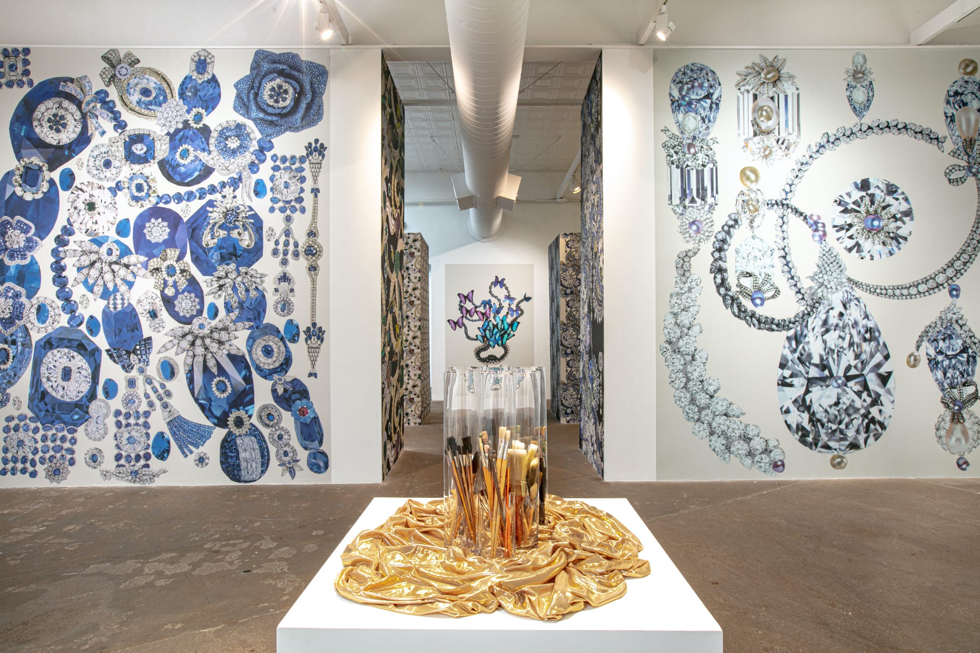 The unabashedly feminine oeuvre of the collagist, sculptor, and conceptual artist is a smorgasbord of shimmer and sequin, a bling manifesto for the senses.