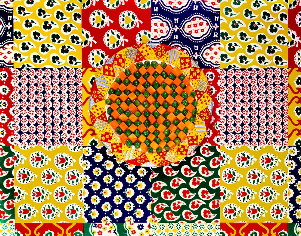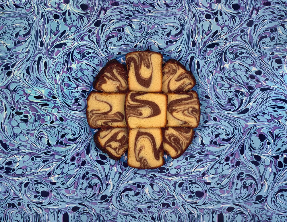 Skoglund’s pairing and arrangement of foods with the matching designs, textures, and colors of the papers is astounding. The careful consideration of hues especially calls to mind the photographs of William Eggleston, while the self-consciously artificial compositions are characteristic of someone like Cindy Sherman — both artists who made some of their best work in the 1970s. “Nine Slices of Marble Cake,” “Luncheon Meat on a Counter,” and “Cookies on a Plate” are particularly arresting for the way they play with the two-dimensionality of the photograph itself. Shot from above, they lack the shadows that would place these compositions in the real world. It’s as if they, like the processed foods they show, only exist in the abstract, as Platonic forms. But isn’t that what commercial photography has always aimed for — presenting the idealized image of something that has and will never exist in real life?