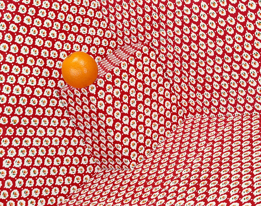 The gleaming white walls of a commercial gallery are perfect for this series, which melds classical still life paintings with Cold War–era consumer culture. Skoglund’s images of corn, peas, and carrots — all obviously taken out of a can — hang on one wall. A second presents us with more obviously processed foods: marble cake, rectangular slices of ham, and Keebler Fudge Stripes. On the third wall, the food is merely implied — save for one lonely orange, the only seemingly natural food in the series — by way of mysterious boxes wrapped in the same contact papers as their backgrounds.