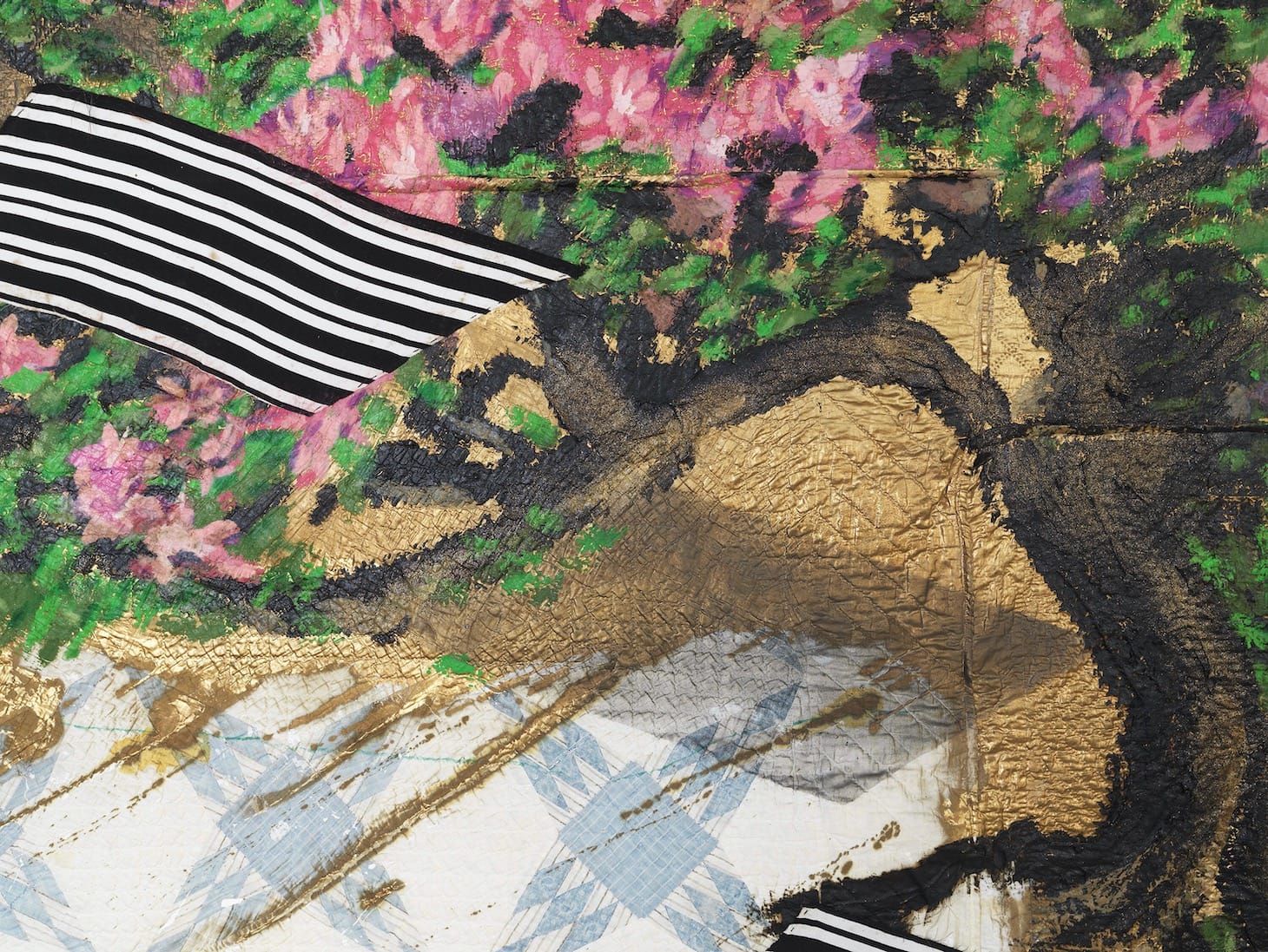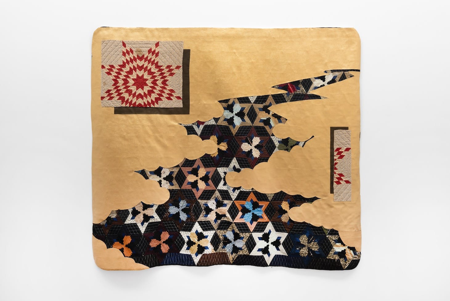 All of these subjects might be doctoral dissertation topics, yet he flits from each to each paradoxically relying on intuition and conviction. He started out as a painter but he has grown into a syncretic compiler of all these interests and avenues of study. For the upcoming exhibition at the Bronx Museum of Art, Codeswitch, he has narrowed the medium bandwidth to focus on quilts. (Well, sort of, the museum indicates that the show consists of about 60 “quilt-based works” which include mixed media paintings and sculptures created directly on or made from pre-1900 antique quilts.) This choice gives me a way in to find out how quilts elucidate how he thinks through the above themes. In March, I spoke to Biggers when the exhibition’s spring opening was looming, before the global pandemic had fully touched down, to get some clarification on what binds together these disparate topics, concerns, and ways of working. What I found was that the quilts give Biggers a way to understand himself within an historical trajectory, a formalist genealogy, and the demands he places on himself.