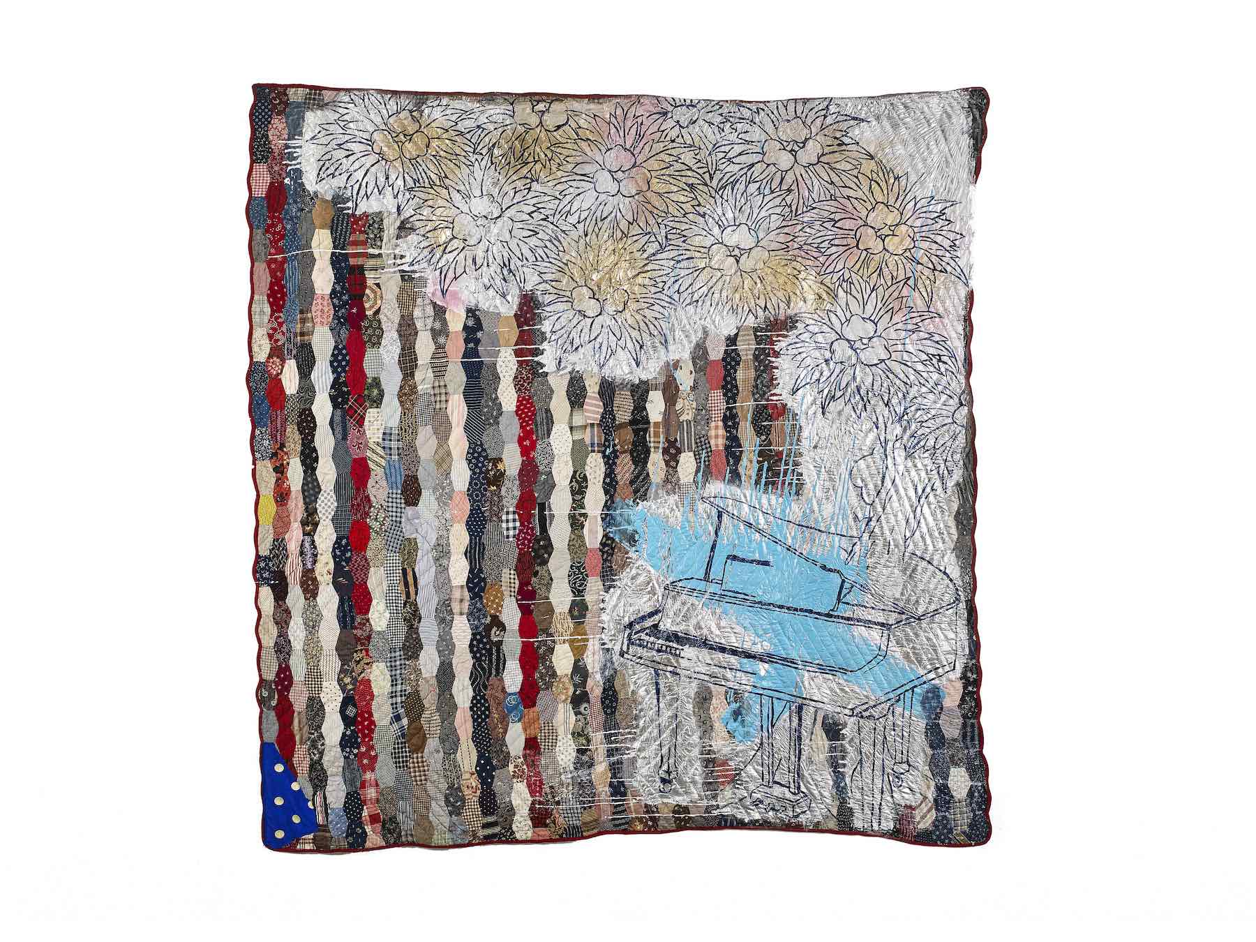 Biggers, who is known for sculpture, video, installation, music, and performance, began the Codex series in 2009, after he was gifted about 50 19th-century American quilts in varying degrees of disrepair. Those familiar with his artistic output will recognize some of his other artworks in their quilted counterparts: “Blossom Study” (2014), a square quilt of small, hexagonal patchwork onto which he has painted the outline of a grand piano bursting with flowers, is a sketch of his 2007 sculptural and sound installation “Blossom,” in which he fused an 18-foot-tall replica of a tree with the belly of a grand piano, its unattended keys playing his recording of “Strange Fruit.”