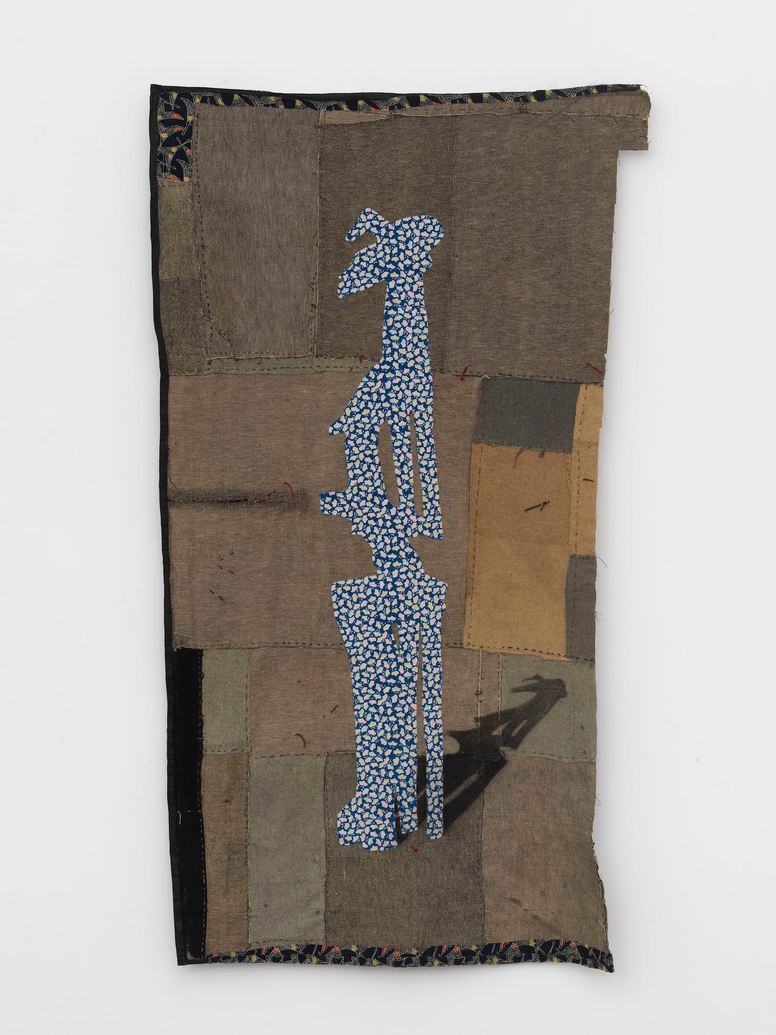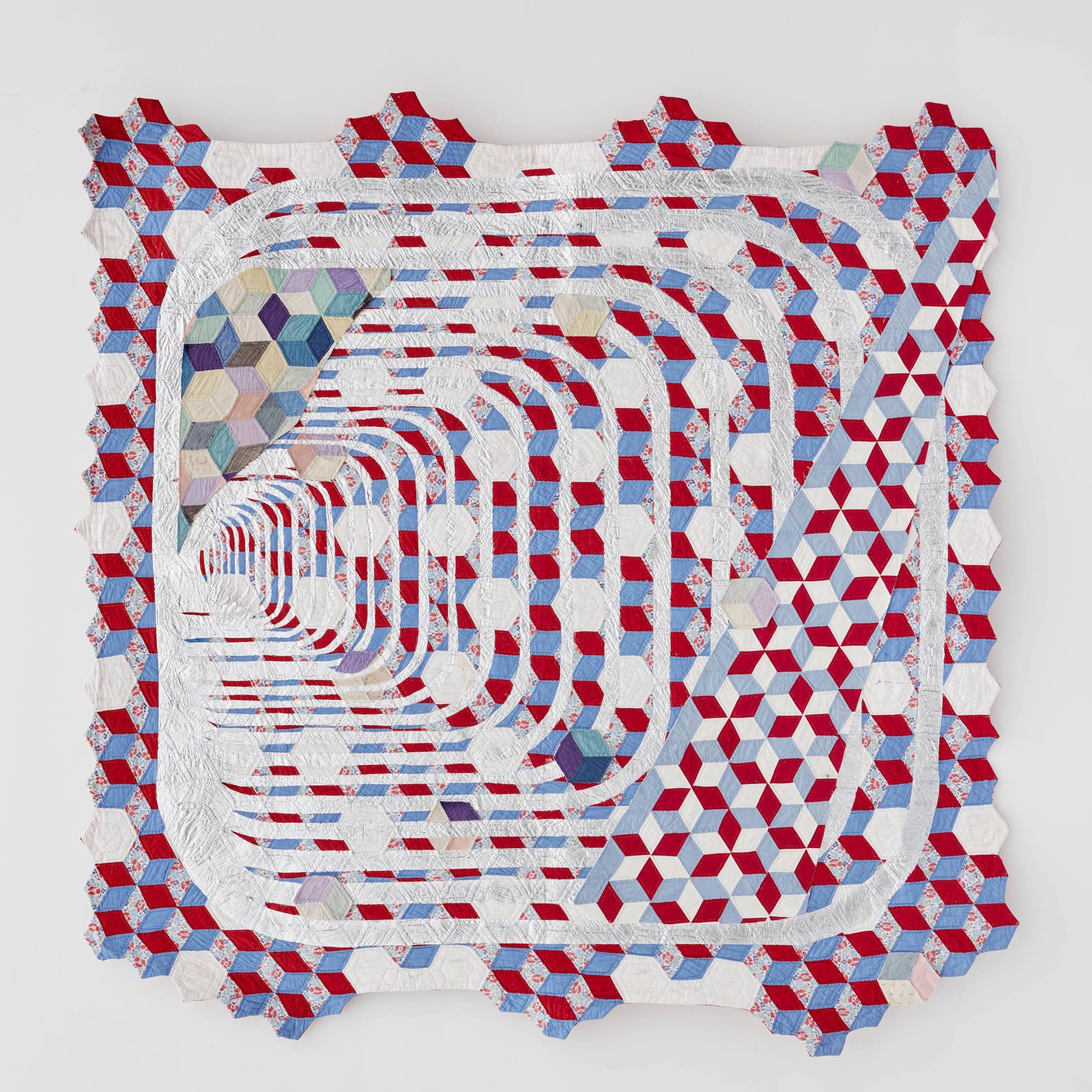 In another subseries, Biggers honors the trompe-l'oeil aspirations held by some quilt makers by adhering sections of fabric to geometric shapes made of plywood, which he joins to compose wall-mounted sculptures that resemble large origami constructions. “Reconstruction” (2019), with its triangular panels of fabric that incorporate the United States flag, calls to mind the rhythmic layering of triangles involved in folding a flag; when viewed from a distance, it also evokes that old Cheshire smile, a visual wink as wry as the double entendre of the piece’s title.