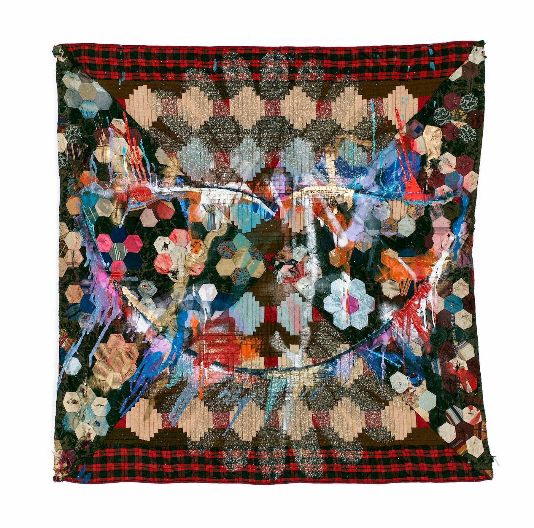 Similar surrogates are present, such as “Floral Seated Warrior” (2017), a portrait-oriented quilt of chunky gray and beige blocks with a blue, floral-print silhouette of Biggers’s “BAM (Seated Warrior)” sculpture (2017). Representations of “Lotus” (2007) — his flower formed from repetitions of a slave ship diagram — and the broad, iconic red lips of “Cheshire” (2008) appear frequently. “Incognito” (2014), for instance, is a square piece composed of bow-tie sections of two different quilts, a cacophony of pattern and color onto which Biggers has added the smudged outline of a Cheshire grin, its sly smile slightly hidden under improvised dashes of gold, blue, orange, red, and lavender paint. The flourishes are, perhaps, vestiges of the artist’s graffiti days (Biggers grew up in Los Angeles, where he participated in the street art scene). As with all his embellishments, they impart a new and distinct layer of meaning to the antique quilts.