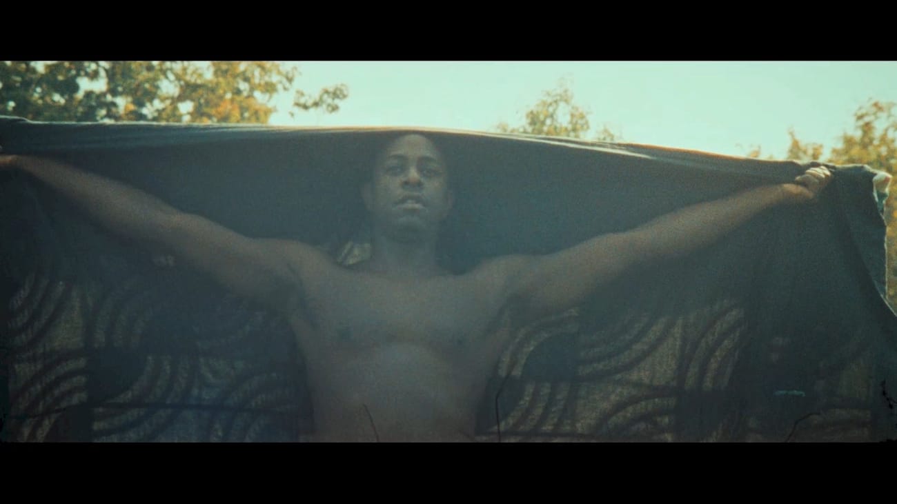 “Moonrising” (2014) is a seven-and-a-half minute video set to music by Biggers’s band, Moon Medicin, and features two Black men in a wooded area. They are variously naked; robed in quilts, hoodies, or mantles of feathers (the artist’s 2006 “Ghettobird Tunic,” perhaps?); or shirtless, wearing jeans, golden masks, and baseball caps as they roam the woods. Sung lyrics allude to the legend of coded quilts leading enslaved people to freedom.