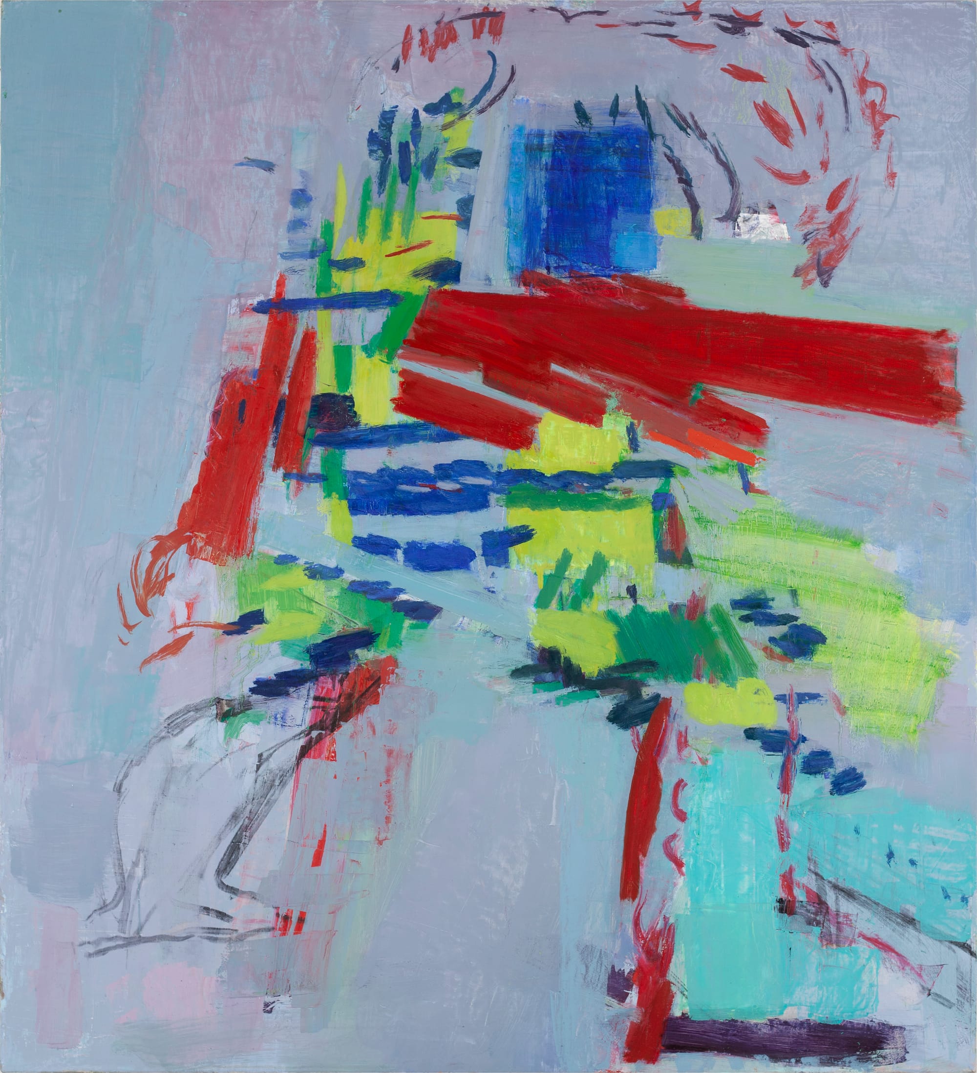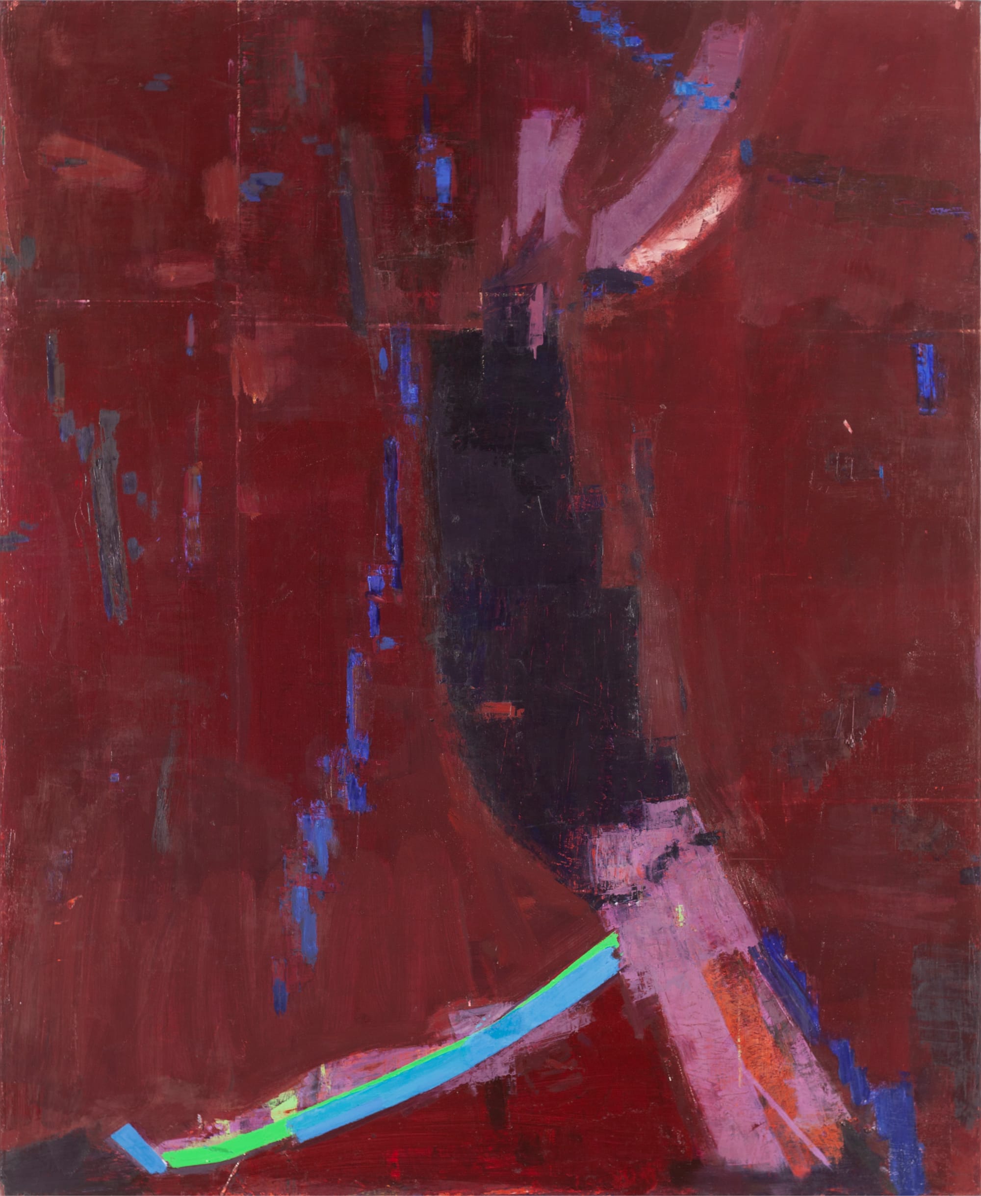 The figure — its many parts — is spread against a ground that changes from light gray-blue to pale violet to turquoise. Some of the marks and forms seem solid and weighty. Others — like the ones above the blue square head — are thin and delicate. Contrary to what might be called generic abstract expressionism, Majumdar does not use a loaded brush. In order to grasp what the artist is up to, it is important for the viewer to acknowledge the paint as paint and mark, as well as to begin discerning the way it links up with a representation of a human.