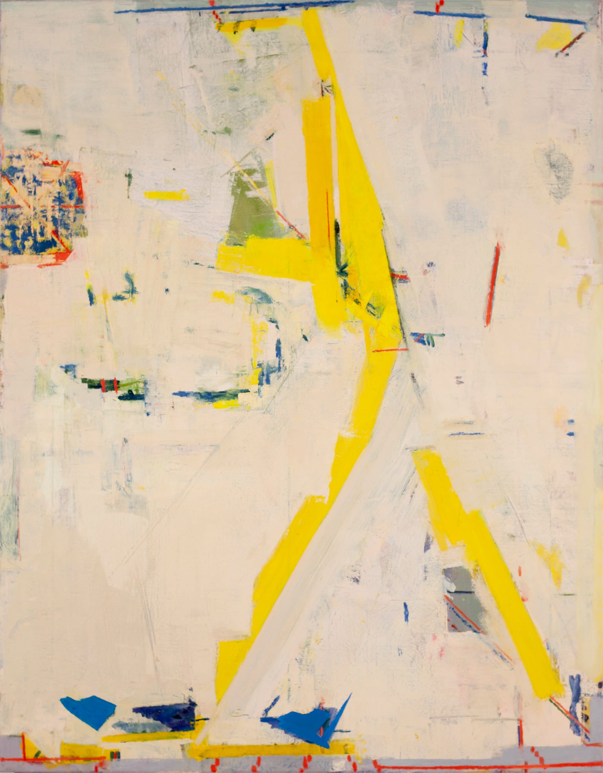 “Giacometti’s Shadow” is poised directly on the border supposedly separating abstraction from figuration. Majumdar’s angular structure is both geometric and figural, a visual sign made of paint. Lots of under-painting peers through, and the ragged blue patches near the canvas’s bottom edge echo both torn pieces of tape and blue booties in stop-motion animation. The act of making the painting echoes the subject. You could say that he is learning a way of drawing in which mastery is beside the point.