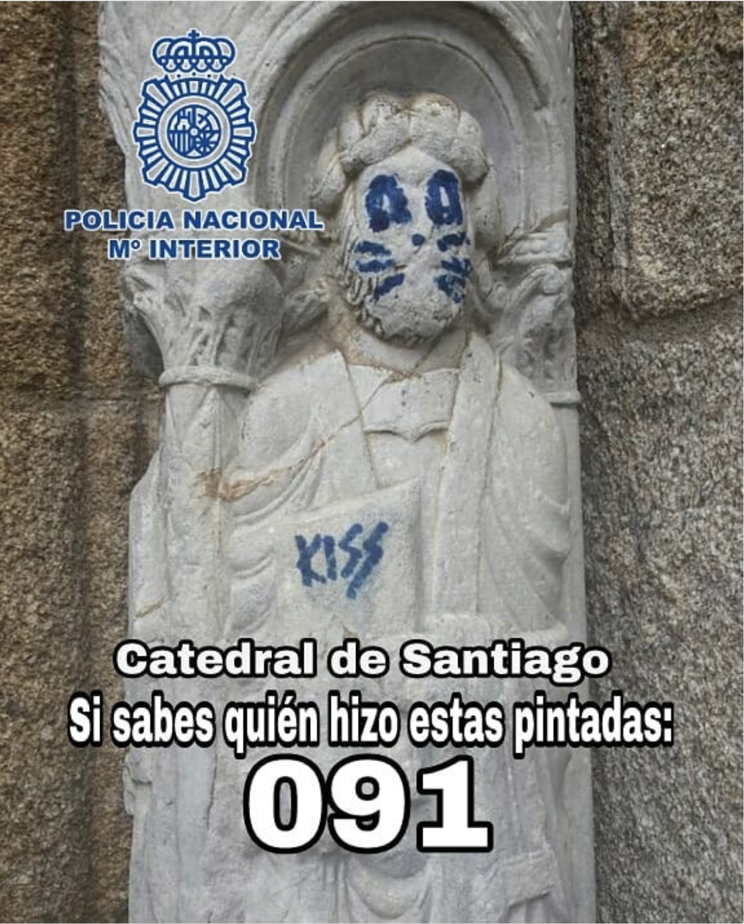No place for hiding, vandals, no place to run! Spanish authorities have vowed to apply the law “with the greatest possible force” in response to a drawing in permanent marker on the face of a Medieval statue from the cathedral of Santiago de Compostela, making over the figure with the iconic face makeup of KISS drummer Peter Criss. Not to put too fine a point on the reference, the vandal also wrote “KISS” on the sheaf of papers held by the statue. ¡Qué lástima!