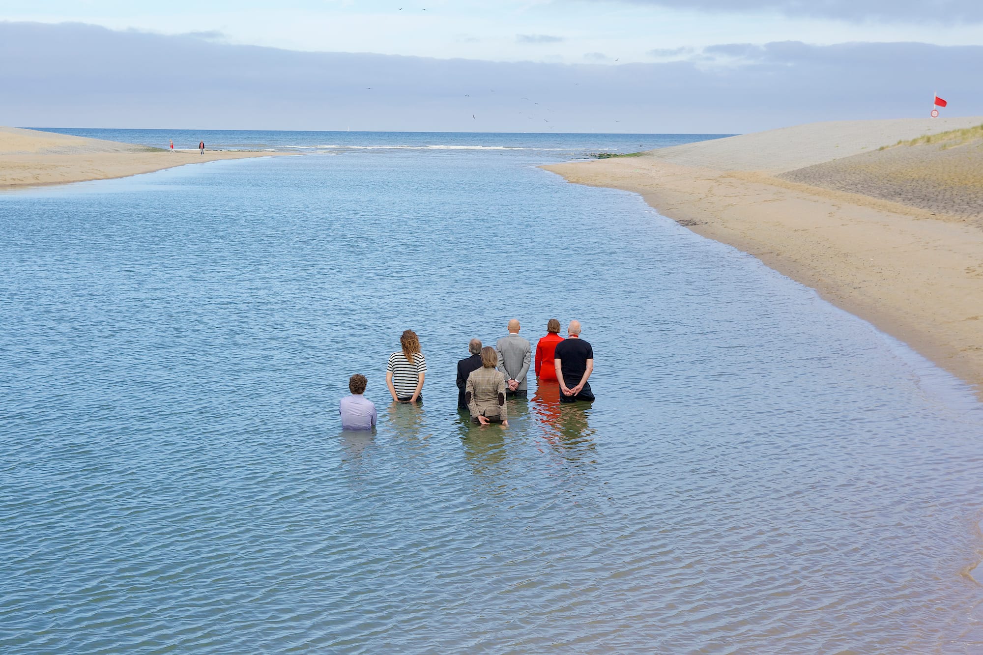 The work is first an image of a figure against a ground: a woman dressed in red facing the horizon. As in a Romantic landscape painting, the human body, dwarfed by its environment, serves as a mirror of nature — a measure of rising tides. But Sunde’s ecological perspective shifts the viewer’s relation to the site from aesthetic to critical contemplation. Walking into the water — and inviting the public to join her — the artist dissolves the one-point perspective of the observer standing outside the frame and addresses the severed connection between landscape and spectator.