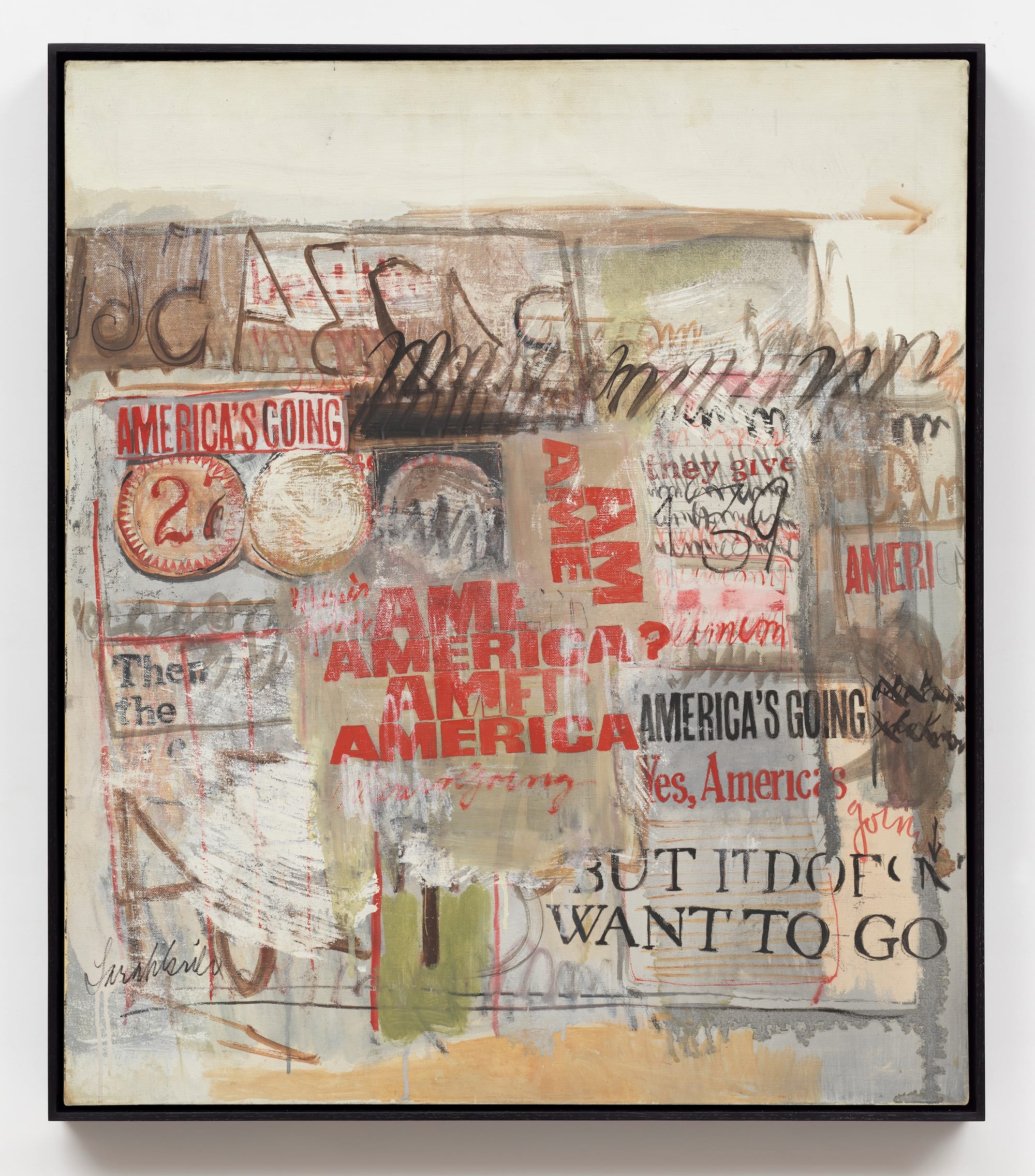 Among the 17 paintings by artist Sarah Grilo in Galerie Lelong’s The New York Years, 1962–1970, one work most dramatically prophesizes the dread-inducing news alerts of our time. The brushwork in beiges, browns, greens, and grays in “America’s going…” (1967) is overlain by red lettering that the artist transferred from newspapers, eerily resembling those red chyrons that flash on our phones and stream across cable news today.