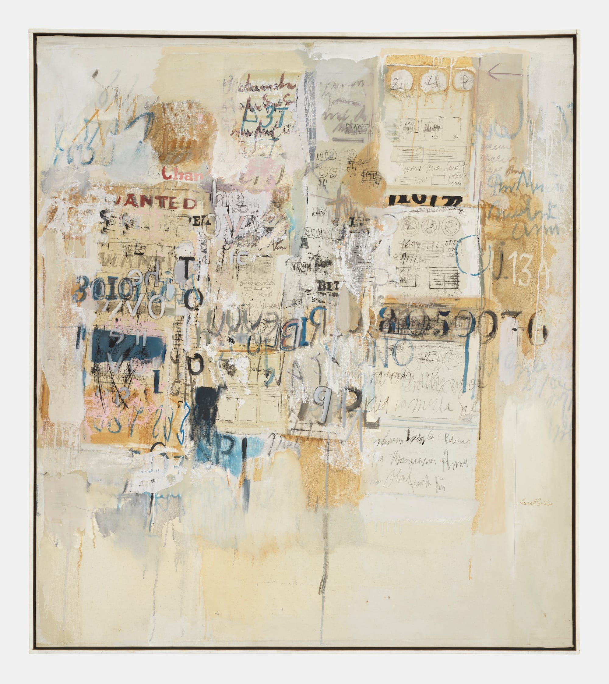 Similarly feverish, large paintings like “Days (Four Zeroes) (1964), “Accused over crisis” (1967), and “Black Wall” (1967) are composed of dissolving monochromatic washes — whites, blacks, and grays — that mimic the controlled chaos of New York’s subway walls, storefronts, and sidewalk sheds. Like those urban structures, the paintings are emblazoned with logos and symbols, handwritten scrawling, tattered advertisements, caustic doodles, and agitprop. In this respect, these paintings encapsulate how New York’s heavily trafficked byways get transformed over time into collage-like public artworks.