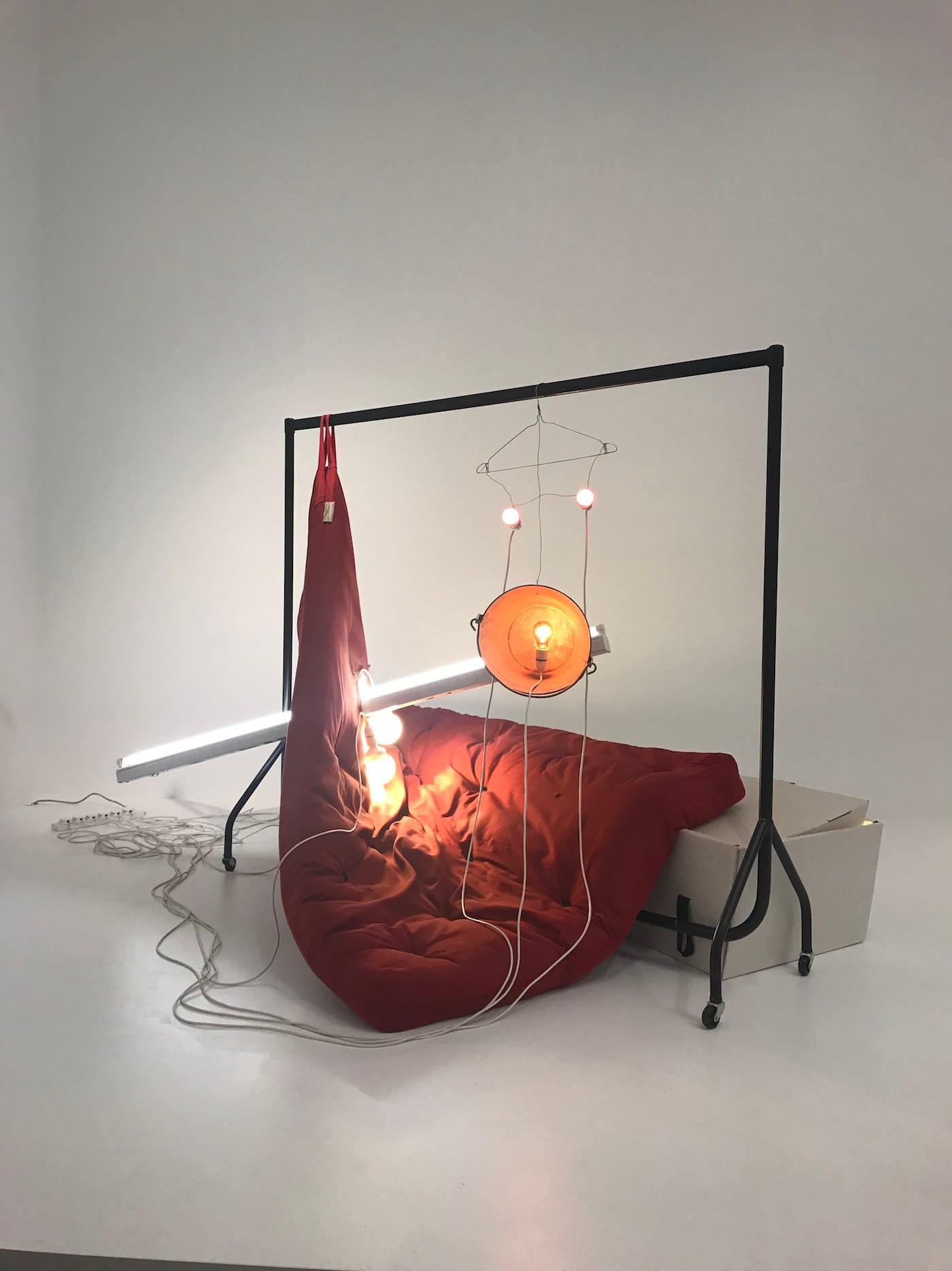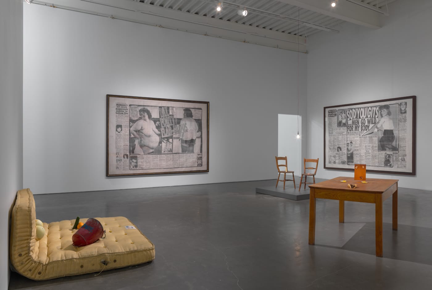 There are two ruined mattresses in Sarah Lucas’ retrospective at the New Museum, called Sarah Lucas: Au Naturel, the British artist’s first-ever American survey. One has the color of curdled milk while the other is a carnal red. The former (1991’s “Au Naturel”) hosts a sexually suggestive arrangement of fruits evoking male genitalia and female breasts that sit above a wide bucket symbolizing a woman’s vagina. The latter (2000’s “The Pleasure Principle”) is hung from a rack and pierced by a fluorescent light, which looks like a post-industrial nod to Rembrandt’s famous “Slaughtered Ox.” A lightbulb-and-wire outline of a woman’s body hangs beside it like a ghost.