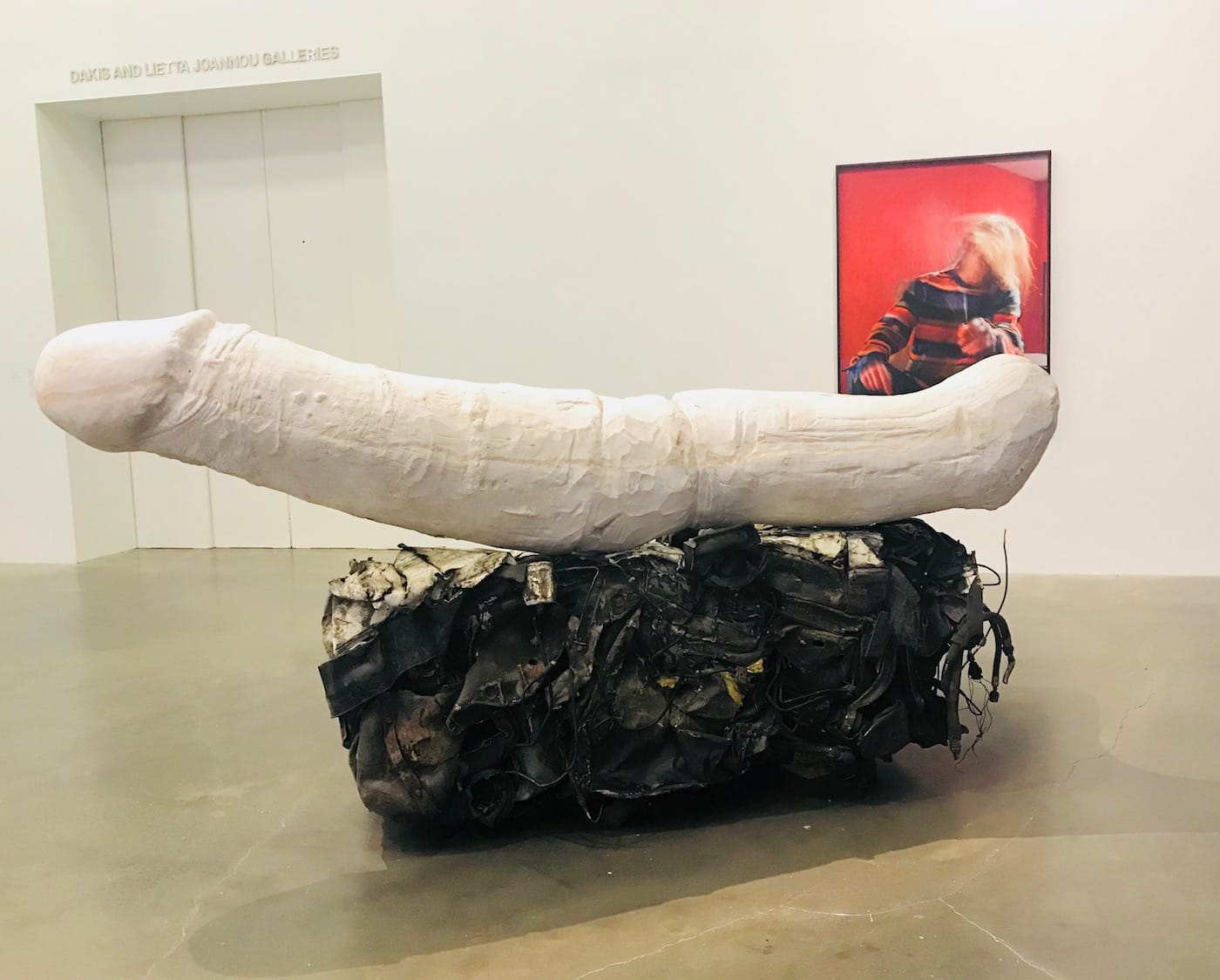 There is good reason that the above-mentioned works are arguably two of Lucas’ most famous. Each situates a feminist body politic within a broader discussion of violence and desire. If the mattress elicits eroticism, then it also symbolizes danger as the site of many sexual assaults. We must disentangle the relationship between power and sex if we are ever to understand the socio-political messages underlying the #MeToo Movement. To get there, it might help to better visualize how gender dynamics work in our culture. This has been Lucas’ remit for much of the last thirty years, despite seeing little change between the culture wars of the 1990s and today. She takes her task in stride with dark British wit and a tongue-in-cheek attitude to boot. She’s also a clever student of art history, incorporating references along the way to everyone from Louise Bourgeois to Dan Flavin, Marcel Duchamp, and Jean Arp.
