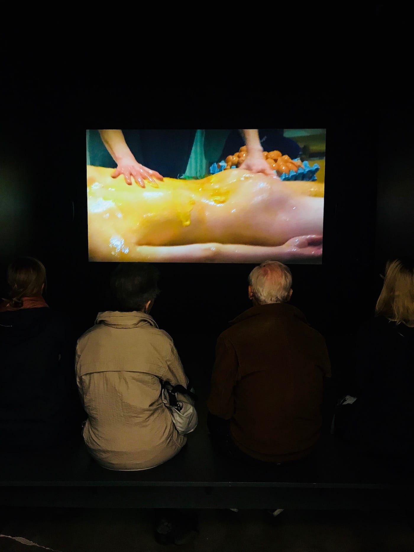 Upon watching this video, I was immediately struck by its parallels and departures from Yves Klein’s infamous “Anthropometry” paintings from the 1960s. For those, Klein instructed his female models to douse themselves in his self-named blue paint before imprinting their bodies on a floor-laid canvas while boozy spectators watched and classical musicians played. Lucas strips away the spectacle of such a performance, removes the canvas, and reverses the gender dynamics — but something about that gesture remains. The egg becomes a reference to the female reproduction system, but the stringed-out yolks that cover Simmons’ body also resemble the consistency of semen. Lucas’s desire to cover her denuded lover in the gooey substance is like a funhouse Freudian mirror into Klein’s own impulse to see his female models coated in paint.