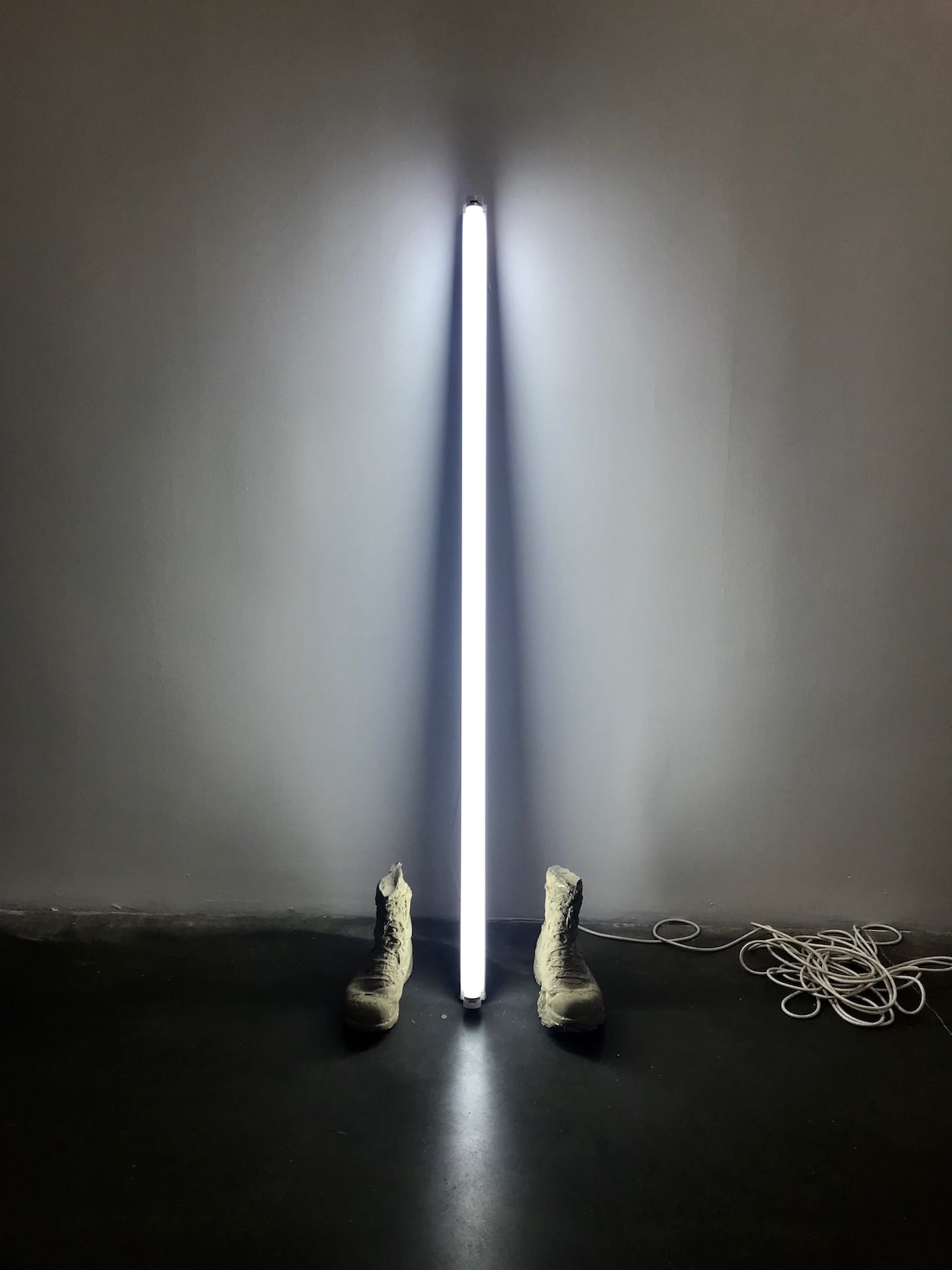 Lucas has long represented a certain pugnacious factor of the feminist art scene, and the New Museum’s retrospective illuminates how fundamental and funny her criticisms of the art historical canon are. Things certainly get political midway through the exhibition, which focuses on works she made around the beginning of the Iraq War. How can you not laugh with bitter irony upon viewing “Unknown Soldier” (2003), which again critiques self-defeating masculinity in context of the Invasion of Iraq by appropriating minimalist artist Dan Flavin’s fluorescent light works? Phallically placed between two soldier boots, Lucas uses the light as a ghostly symbol, a mournful lament of how masculinity can often beget unneeded belligerence.