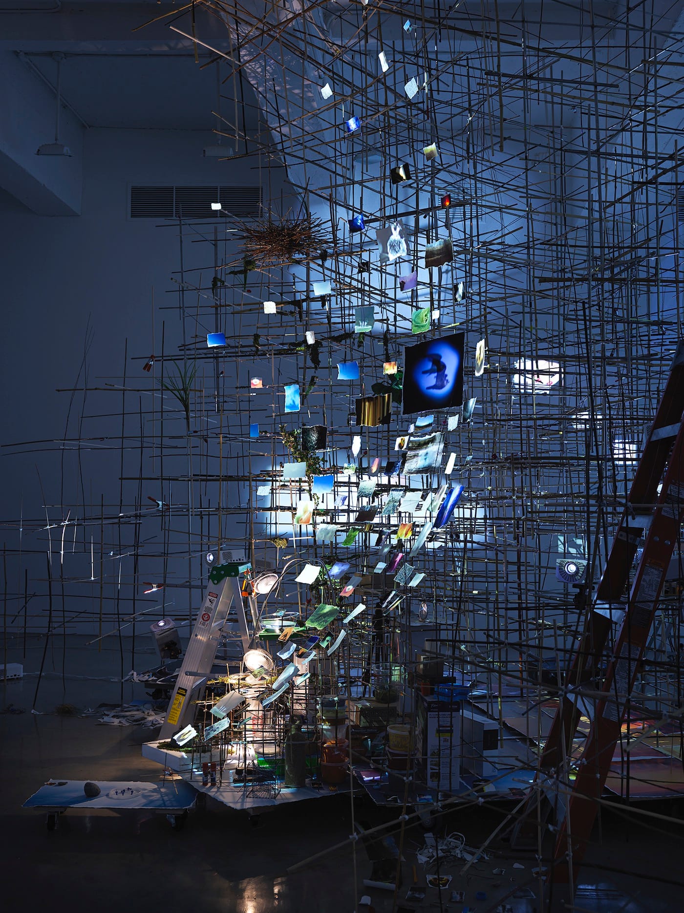 In a dark room upstairs, “Images in Translation” (2019), a miniature installation resembling “Crescent (Timekeeper),” including a table, computer, and digital rendering projected on the wall, functions as a working sketch for the larger sculpture. It also enables Sze to exert a modicum of control over the anxiety of image and information overload. Sze has always been concerned as much with how things are taken apart as with how they are assembled. At Tanya Bonakdar this approach resonates vividly with a world racked by tectonic political, social, and environmental shifts.