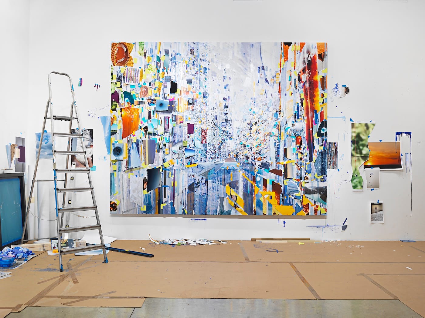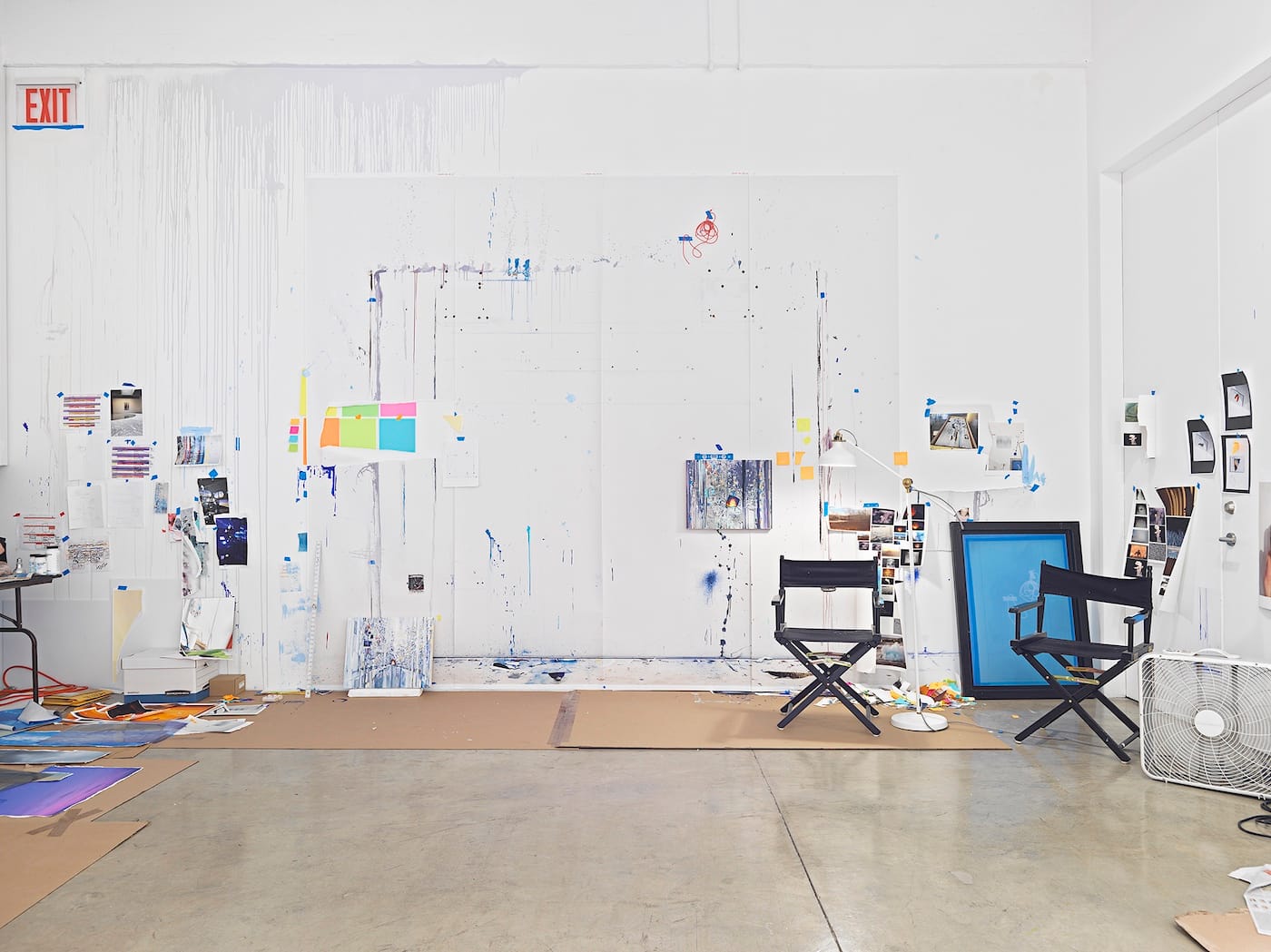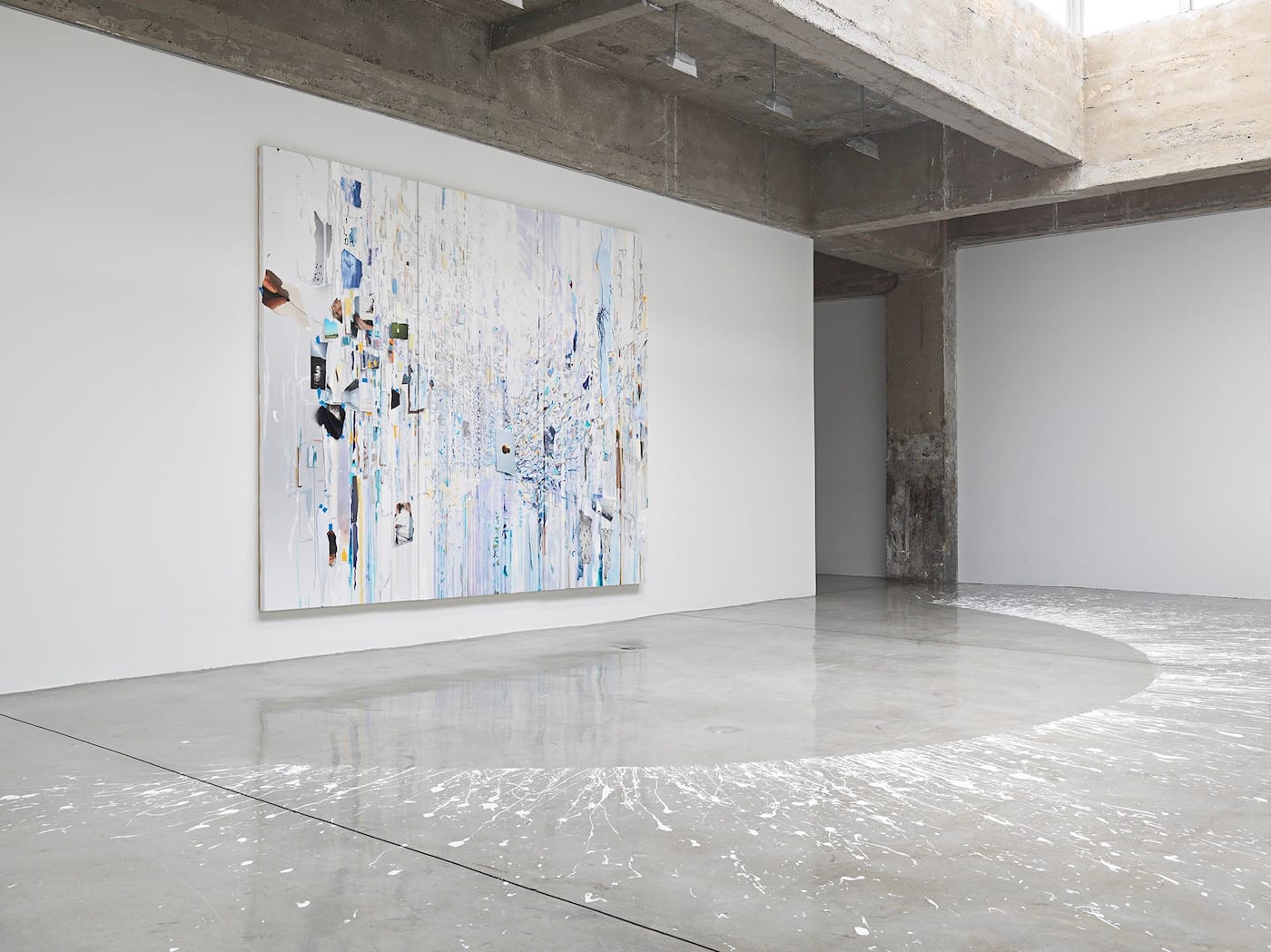 Skeins of paint drip down the windows and front door of Tanya Bonakdar, which are also embellished by photographs taped to the glass, and painting supplies are stacked immediately inside. The objects gathered on or near the door and windows on the east, or right, side of the gallery’s facade, constitute the installation “Images in Refraction (East)” (2019).