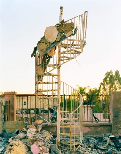 Wildfire might be considered a sequel to Bezzubov’s earlier project, Things Fall Apart in which he documented the effects of natural disasters in both the U.S. and abroad. In his artist statement for the series he wrote, “Using the genre of landscape photography, a tradition born with and used to celebrate industrial expansion, these photographs evidence the fragility of the man-made as it is transformed into dreamscapes of apocalyptic proportions.” These words certainly apply to the current exhibition as well where soft light, shallow depth of field, and scenes eerily absent of people remind the viewer of nature’s power over man with great poignancy. “Wildfire #86” (2007) shows a burnt wreckage of a car, now at the bottom of a ravine like one of many boulders resting there in a pile of ash, and in “Wildfire #78” (2007) the spiral staircase of what used to be a home reaches skyward against the backdrop of a setting sun.