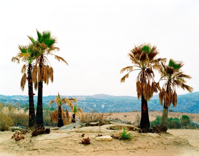 Bezzubov’s large format prints hang in this tiny space in an impressive, though decidedly quiet manner. The work documents ravaged landscapes on the West Coast following devastating wildfires. That is, rather than capture the fires themselves, these images show what is left in the wake of such trauma — charred remains of homes, smoldering tree trunks, scorched earth. Two pairs of burnt palm trees in “Wildfire #15” Witch Creek Fire, San Diego County, CA (2007) frame a desolate, ashen landscape totally devoid of any trace of man, as if this place was abandoned and then forgotten in the wake of the cataclysmic event. Heavy silence fills each frame, but this tone also lends the viewer a chance to pause and meditate on these images of loss.