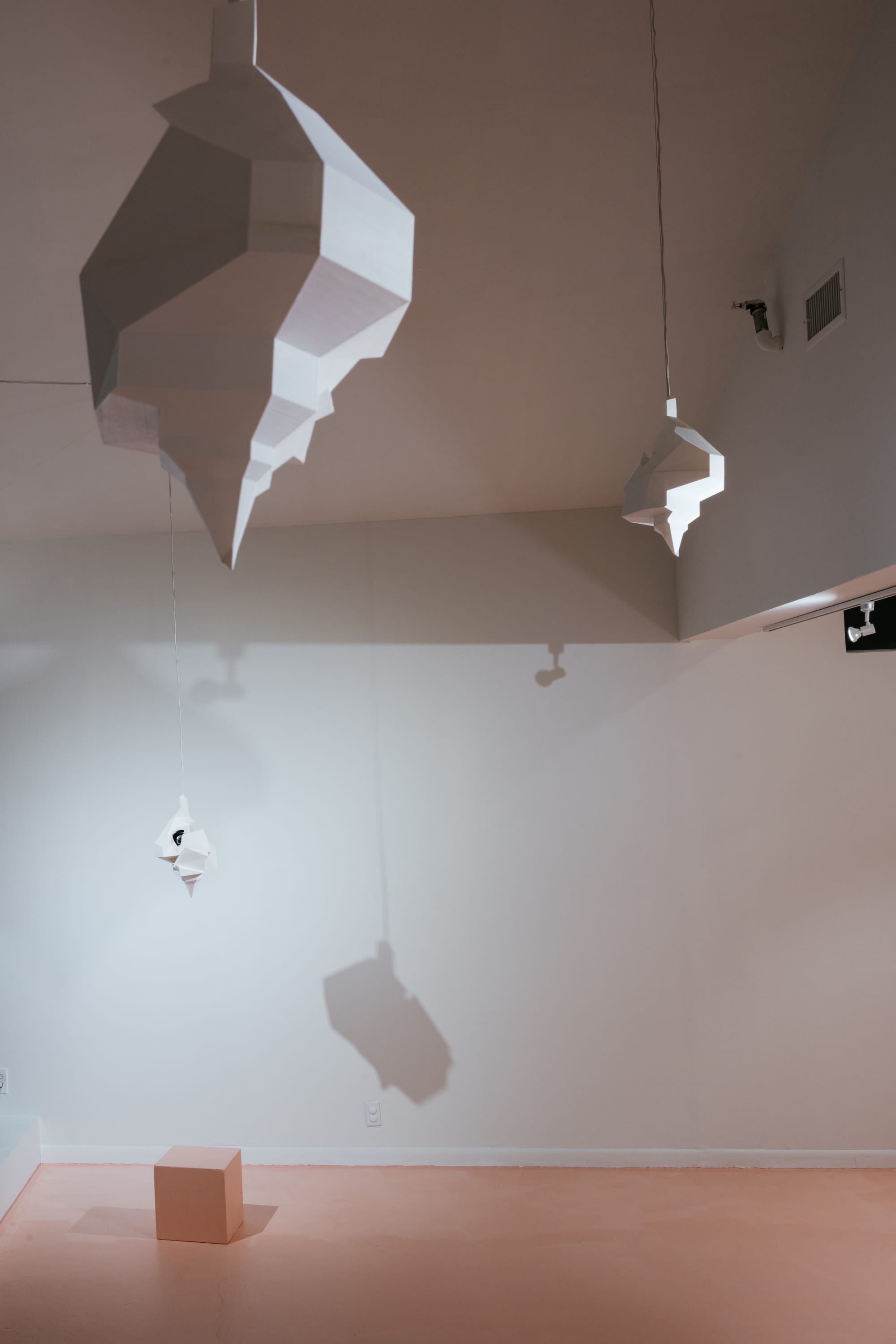 The titular work is a series of 3D-printed polymer conch shell-shaped sculptures that hang from the ceiling and serve as speakers for remixed renditions of the Mourner’s Kaddish. Wortzel created these recordings by asking friends, artists, and poets to interpret the prayer for themselves. The gentle hum of these sculptures guides us through the gallery in a winding maze, an allusion to the occlusion effect that occurs when we hold a conch shell up to our ears.