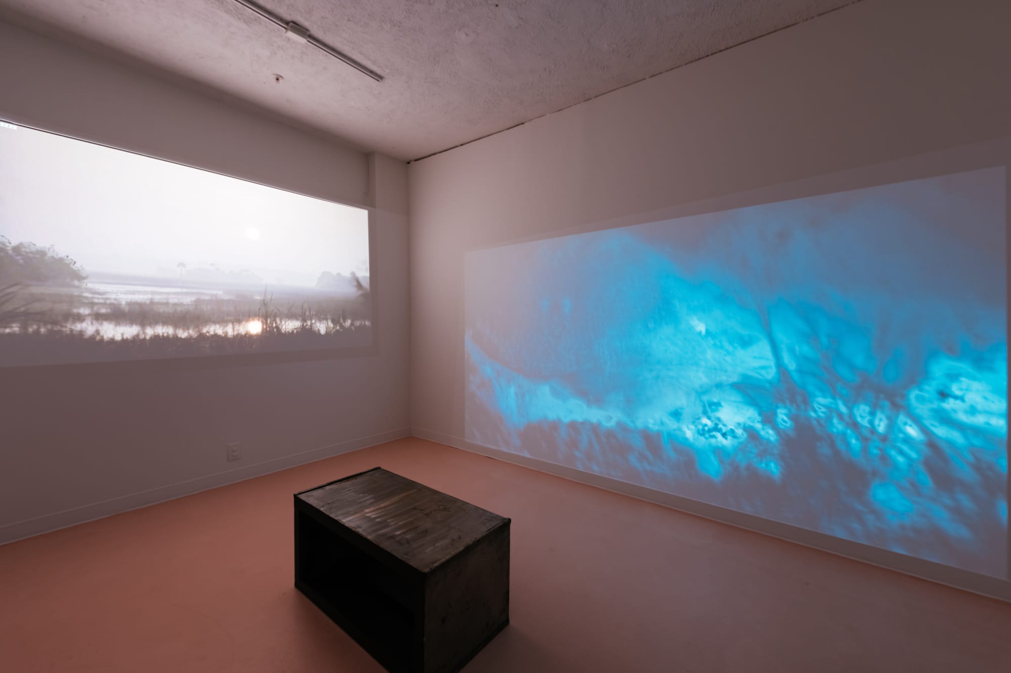 In two opposite galleries, Wortzel displays three interconnected video installations, the “sunrise,” “sunset,” and “labor” iterations of For those of us who live at the shoreline (2021), which orient us to considerations of place despite not revealing where they were shot. While the sunset unfolds in real time — capturing the elusive ‘green light’, a blink or you’ll miss it moment — the sunrise is manipulated to gently bounce in the air. Its 16-minute sequence of a sea turtle nesting into the sand requires patience but is surprisingly emotional.