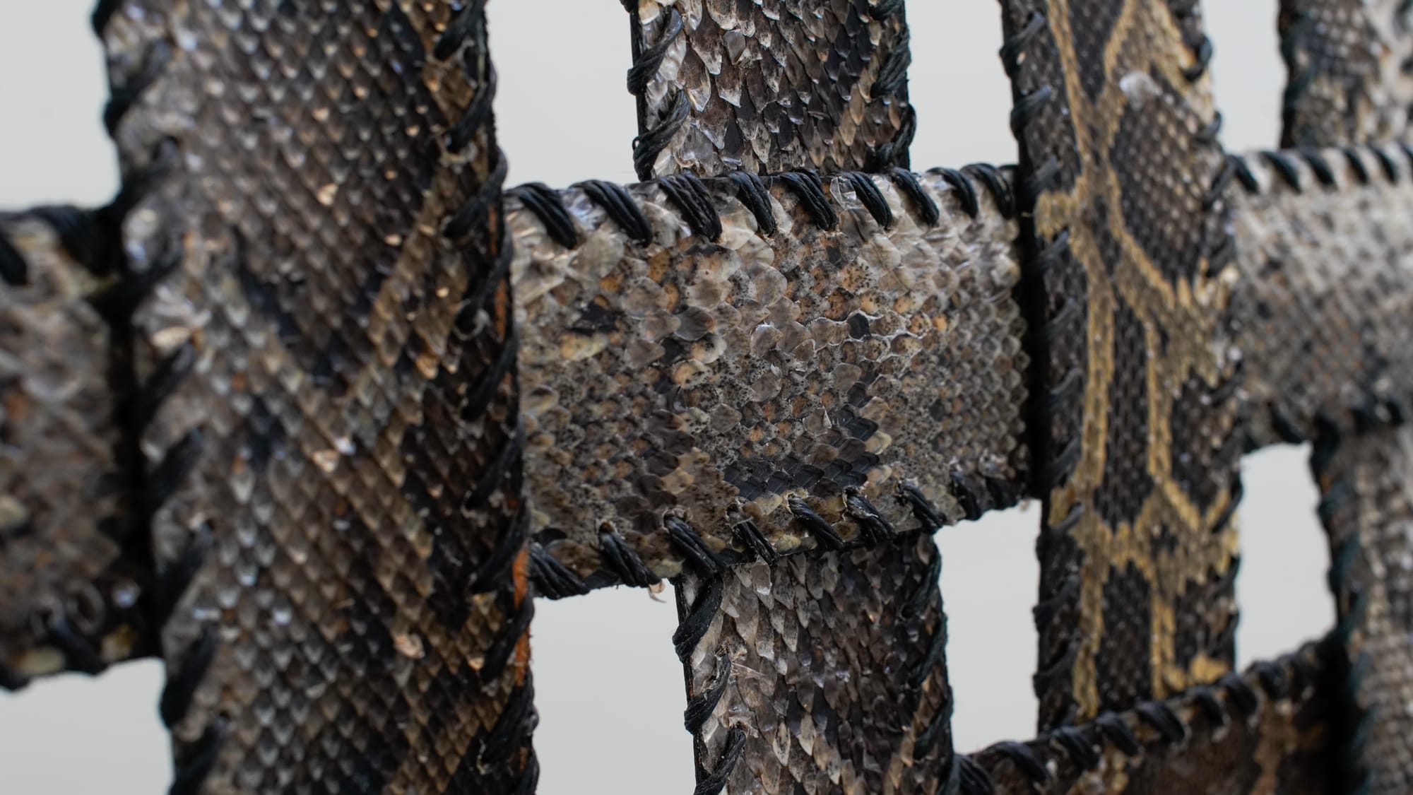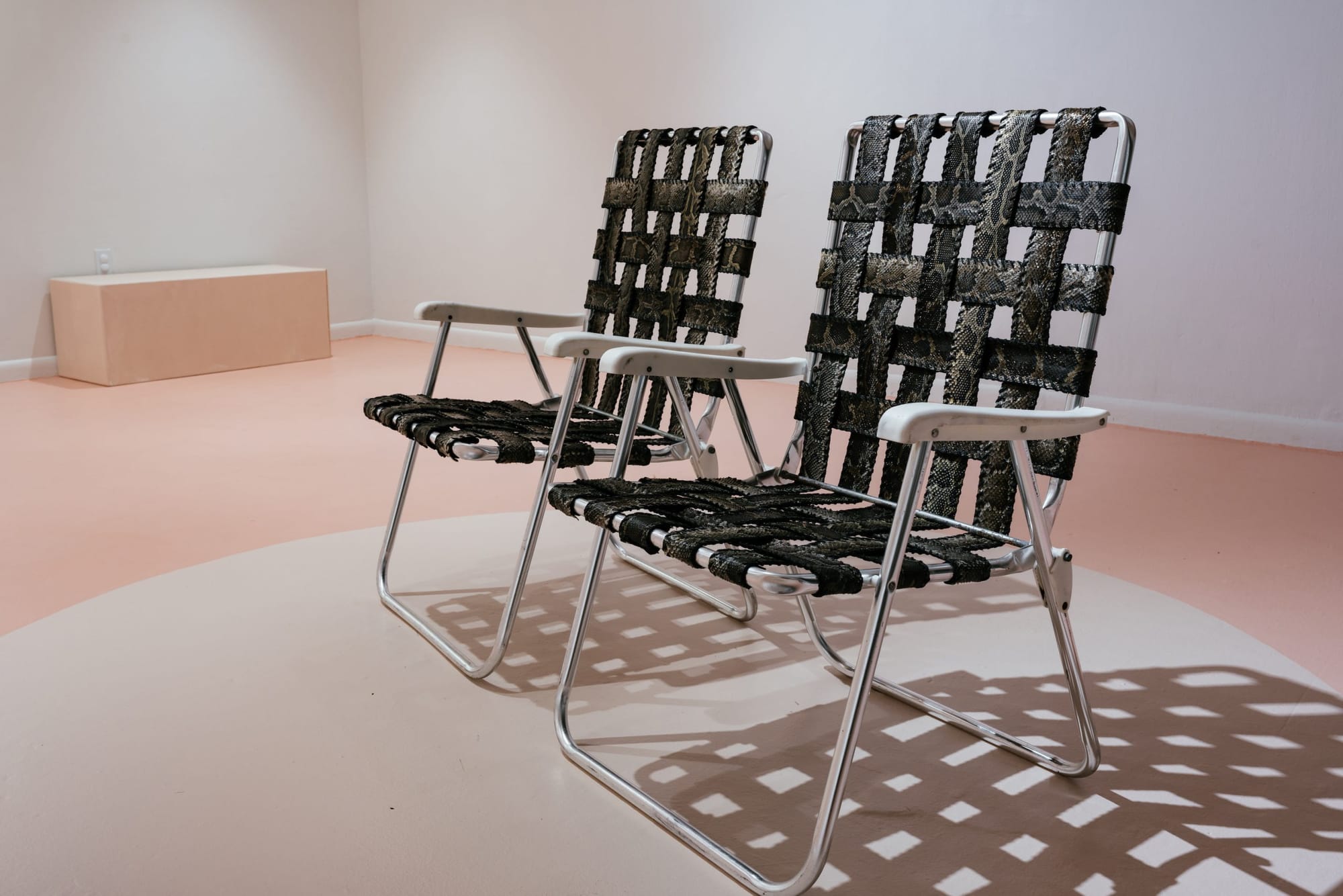 Upstairs, “Sitting Shiva” (2020) occupies the center of the gallery: two quintessential woven beach chairs, the customary woven backs of which have been replaced with the skins of invasive Burmese pythons. Enveloped in natural light from the gallery’s expansive, sunny windows that reflect off soft blush-painted walls, this work reminds us to pause, reflect, and honor the passage of time, migrants, and communities that share the same shoreline that inspired the exhibition.