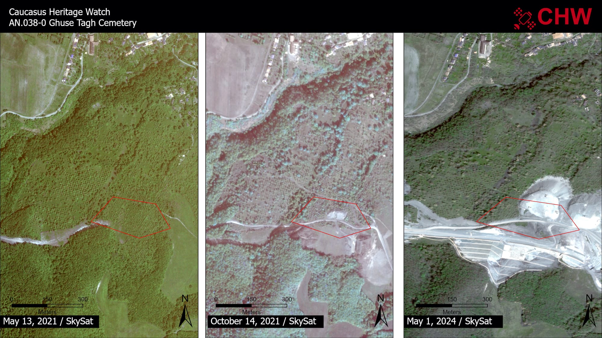 Through satellite image comparisons between fall 2023, when more than 100,000 ethnic Armenians were forced out of their homeland by the autocratic Azerbaijani regime, and spring 2024, CHW's latest report draws attention to the destruction of historic schools, burial grounds, and sacred places, and identifies a 29% increase in sites classified as threatened across Artsakh (also known as Nagorno-Karabakh).