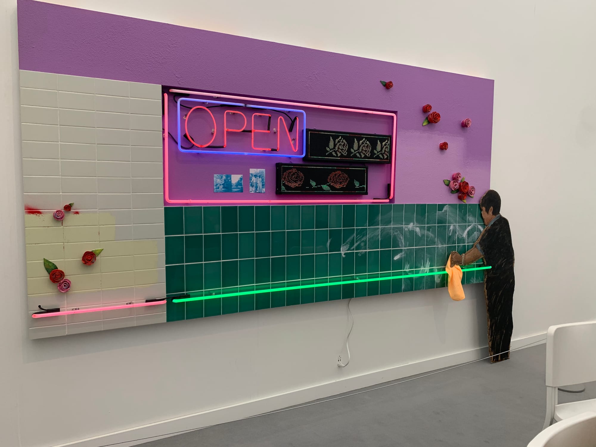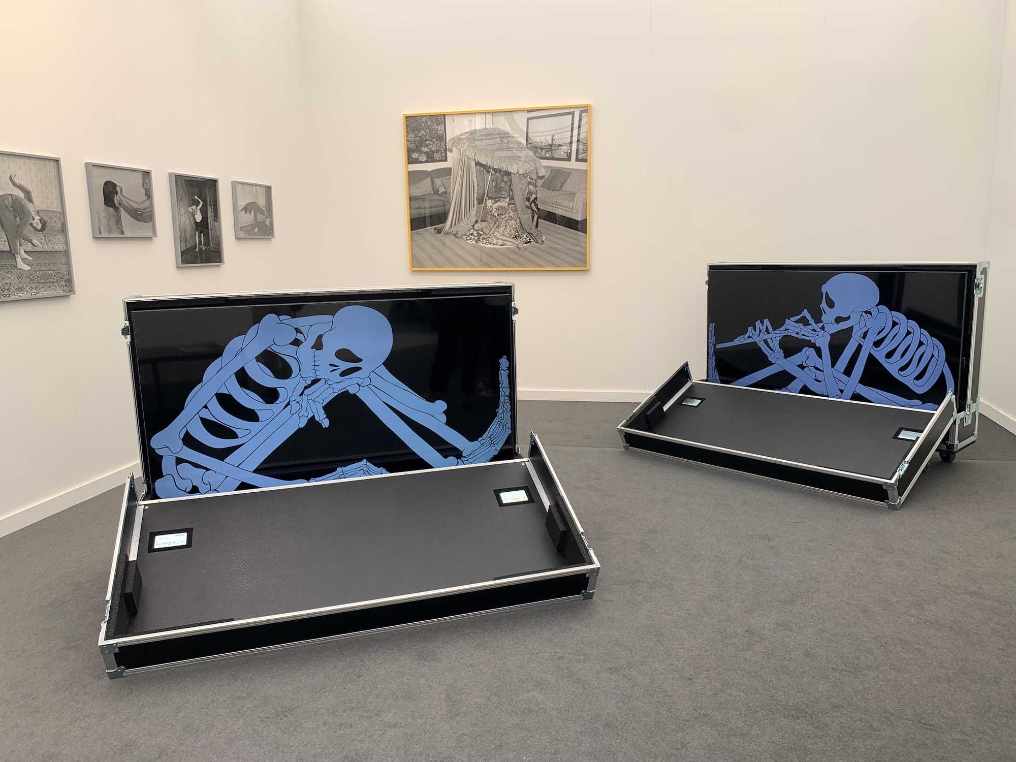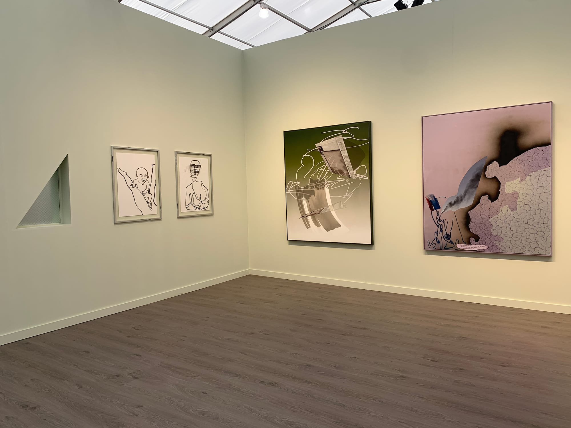 Other standout booths throughout the fair include Emalin/Southard Reid, with a striking combination of black-and-white works, pairing the photographs of Joanna Piotrowska together with the darkly humorous animations of Özgür Kar; Hauser & Wirth, with a mint-green architectural installation highlighting the elusive dimensionality of new works by Camille Henrot; and Alexander Gray Associates, exhibiting the figurative paintings of legendary feminist and 89-year-old icon Joan Semmel. Also of note are works by artists Patrick Joseph Martinez and Jay Lynn Gomez, whose collaborative work shines a spotlight on the labor underpinning the art world, and Devin Reynolds, whose textural, graffiti-laden paintings celebrate the aesthetics of Black and brown communities — serving as a sharp reminder of the Los Angeles that exists outside of Beverly Hills and the art world.