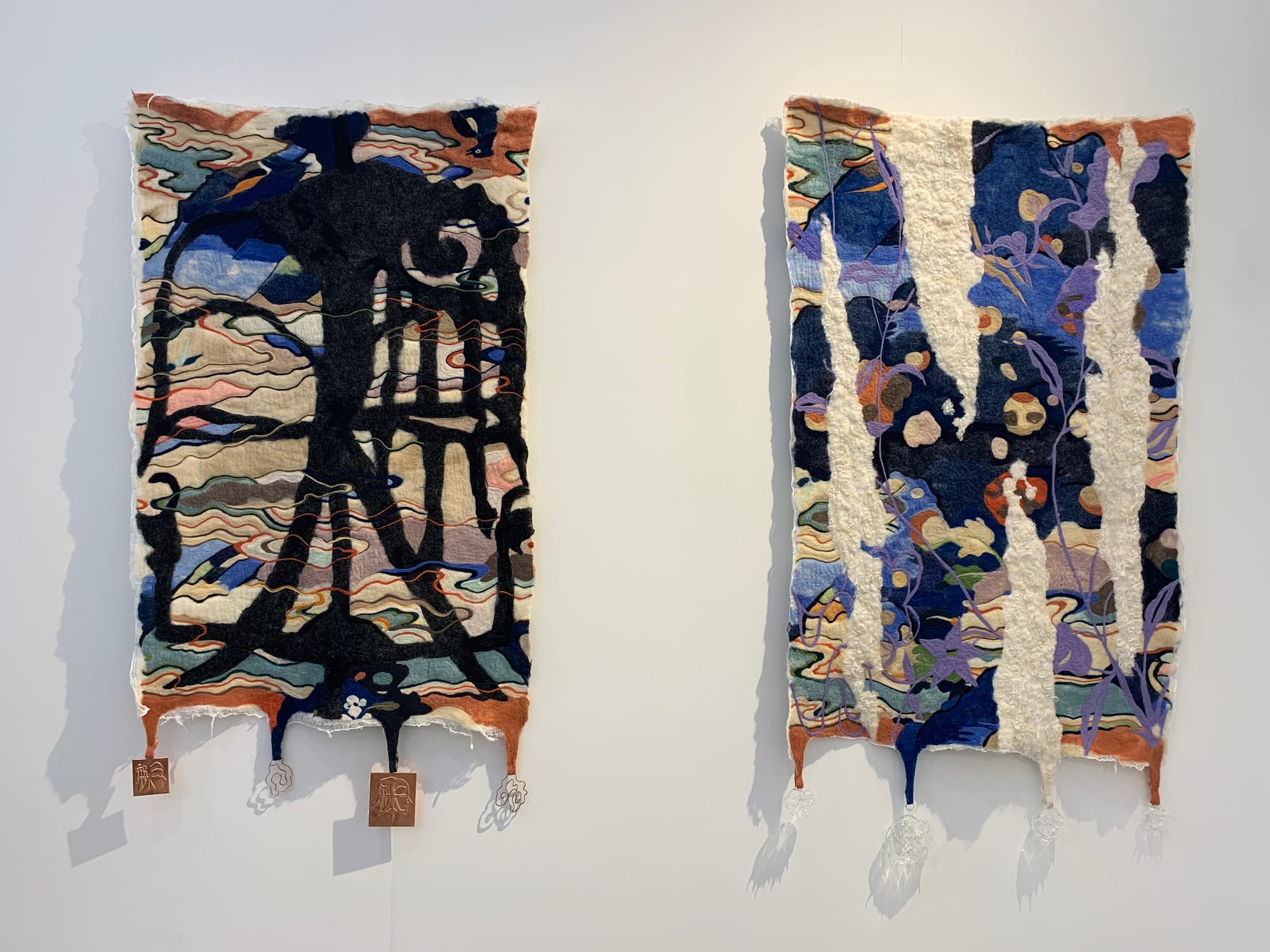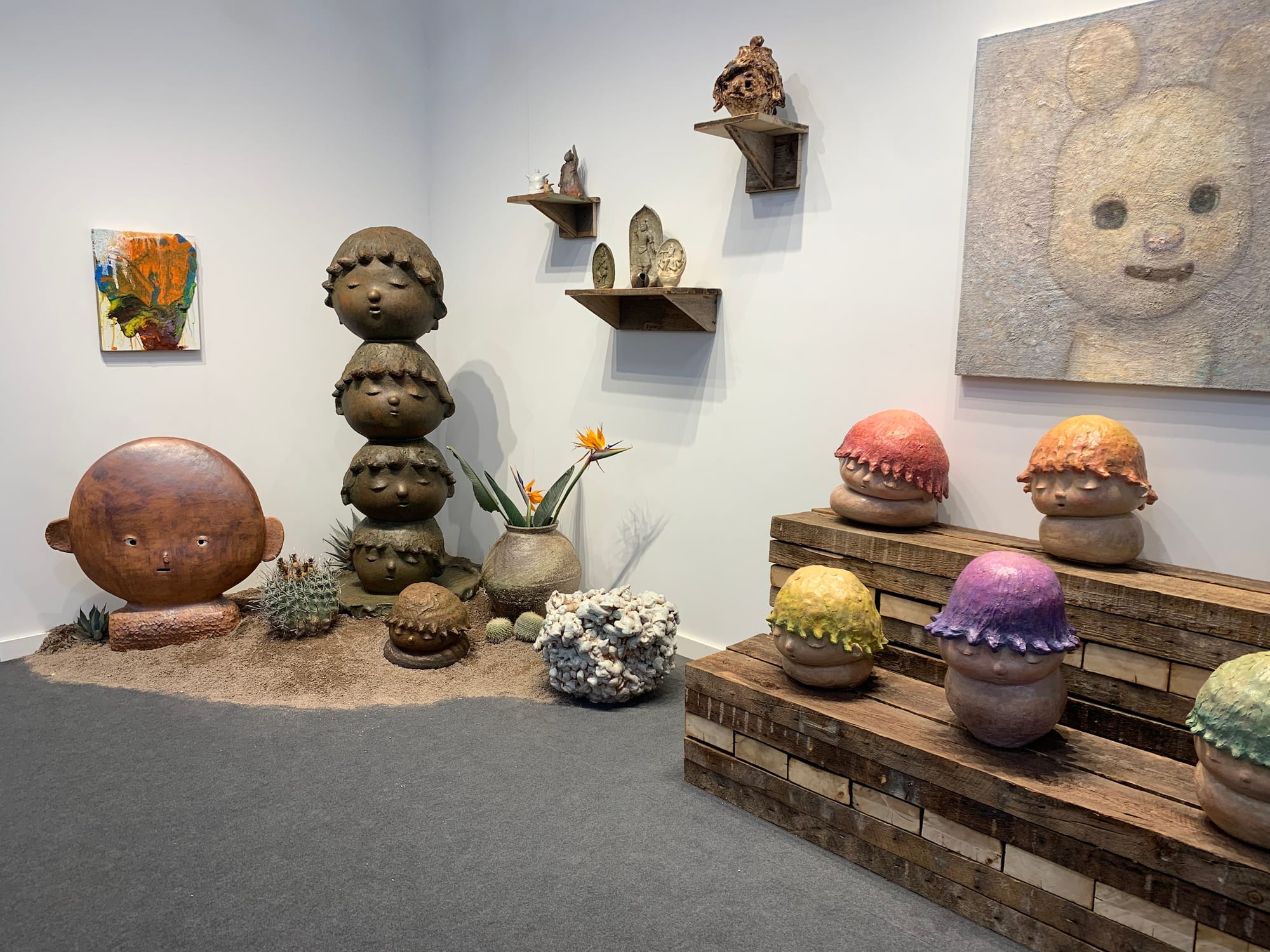 Nowhere is this sense of materiality more on display than in the fair’s Focus LA section, which features 11 young LA-based galleries curated by Amanda Hunt, director of Public Programs & Creative Practice at the Lucas Museum of Narrative Art. Hunt’s interest in subversive uses of material is evident in the selection of artists, from Eric-Paul Riege (represented by Stars) — whose fiber-based work are equal parts sculptural installation as they are material and ritual extensions of the artist’s Native Hózhó philosophy — to Sarah Rosalena Brady (represented by Garden), who merges technologies such as artificial intelligence and 3D printing with traditional craft mediums such as textiles and ceramics. Perhaps best encapsulating the section’s focus on unconventional material is In Lieu gallery, whose booth brings together terrazzo sculptures by Ficus Interfaith with felted tapestries by Pauline Shaw in a funky, yet oddly complementary pairing.