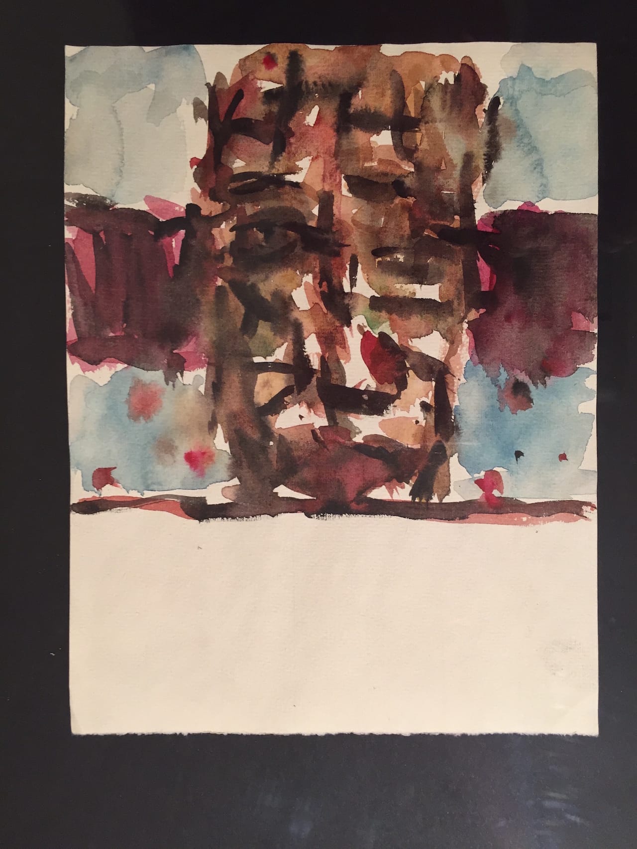 A painting begun shortly after Marwan’s return from Paris is the focus of attention in the exhibition’s grand, main gallery. But the date on it (1977) bears witness to Marwan’s habit of revisiting pictures and changing them — often repeatedly. Like many of his pictures, this work clearly depicts a man’s face — the artist’s. It’s painted in scrawls and patches of tempera on canvas, and makes the large surface into a looming, frightfully unsettling presence. Measuring roughly 6 x 4.5 feet, it towered over my head. Additionally, the face is shown from an oblique, low angle, as though it belonged to a giant. The rendering of the jaw is unclear: it seems to go on interminably, beyond the bottom edge of the canvas. The eyes are immense and bug out, such that there’s no escaping their gaze. It is truly a saturnine visage.