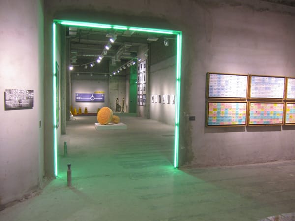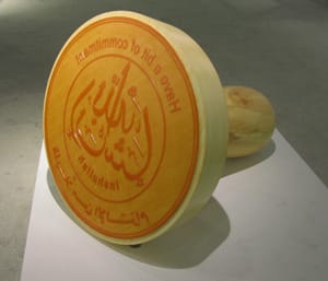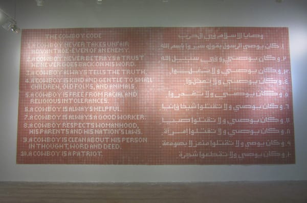 The room devoted to the past explore how the artists view their faltering tradition in the context of globalization and questions if it is a good thing. One has to understand that religion obviously plays a very important role in Saudi society, and it is well integrated in every tradition in their culture. Coming to terms with how their ideology fits in within the global context of humanity is a constant “challenge.” Here is where artist Ahmed Mater showcased his latest piece “Cowboy Code” (2012), which is a dramatically large sheet of plastic cap gun discs that state the virtues and living code of cowboys adjacent to a similar-sounding code as stated by the Islamic Prophet Mohammed. It is a nostalgic piece of how Saudi boys grew up imitating the Wild West, but takes it further to show how in the artist’s opinion all “religions” are equal in their message and code of living.