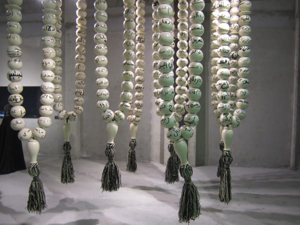 Another work by Manal Al Dowayan, “Esmi – My Name” (2102), stole the show. The large installation is comprised of giant rosaries bearing the names of women from all over the Kingdom. The work required female Saudi volunteers to write their full names on the giant beads that are hanging in the space. The installation refers to the ridiculous habit of boys and men in Saudi Arabia who feel ashamed to mention the names of their mothers and sisters. There appears to be no clear indication as to where the root of this behavior stems from, but it appears to have absolutely no relations to religion or even historic tradition.