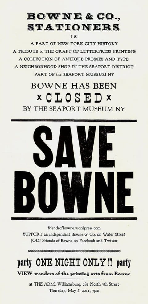 A new group called “Friends of Bowne” have created a broadside, fittingly printed at The Arm studio in Williamsburg, to fight for the studio. The elegantly printed sheet notes that the Bowne studio is “a part of New York City history” and “a tribute to the craft of letterpress printing,” not to mention “a neighborhood shop in the Seaport District.” See the full flier at the bottom of this post. The print isn’t just a public protest — the group is organizing an awareness-raising party and exhibition for Bowne.