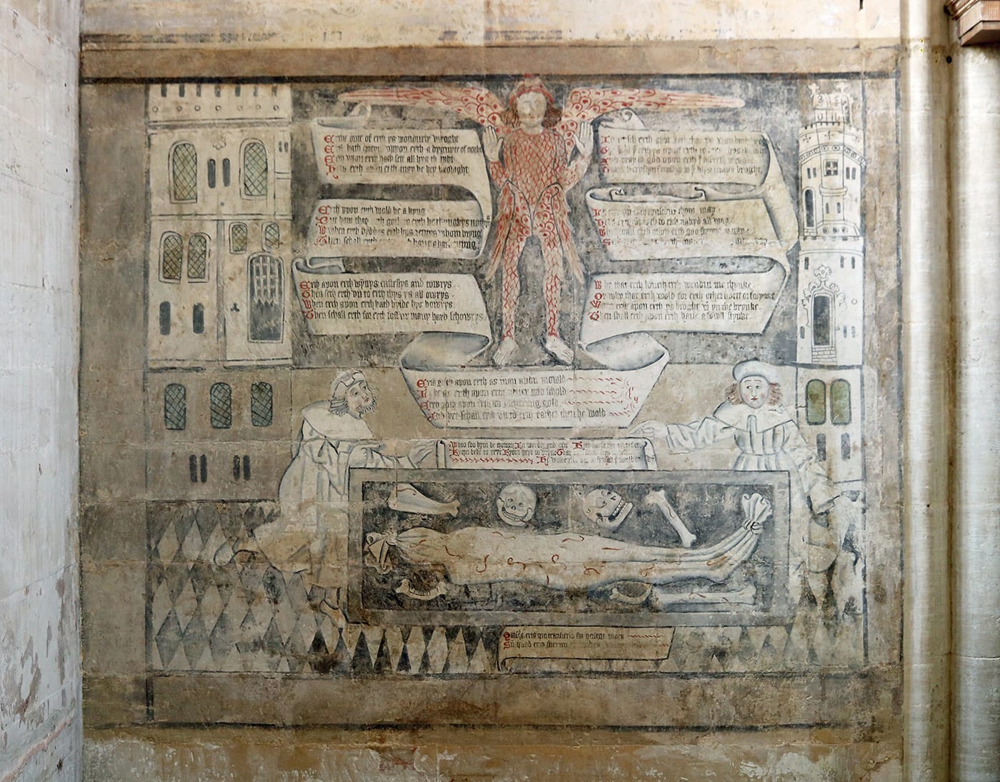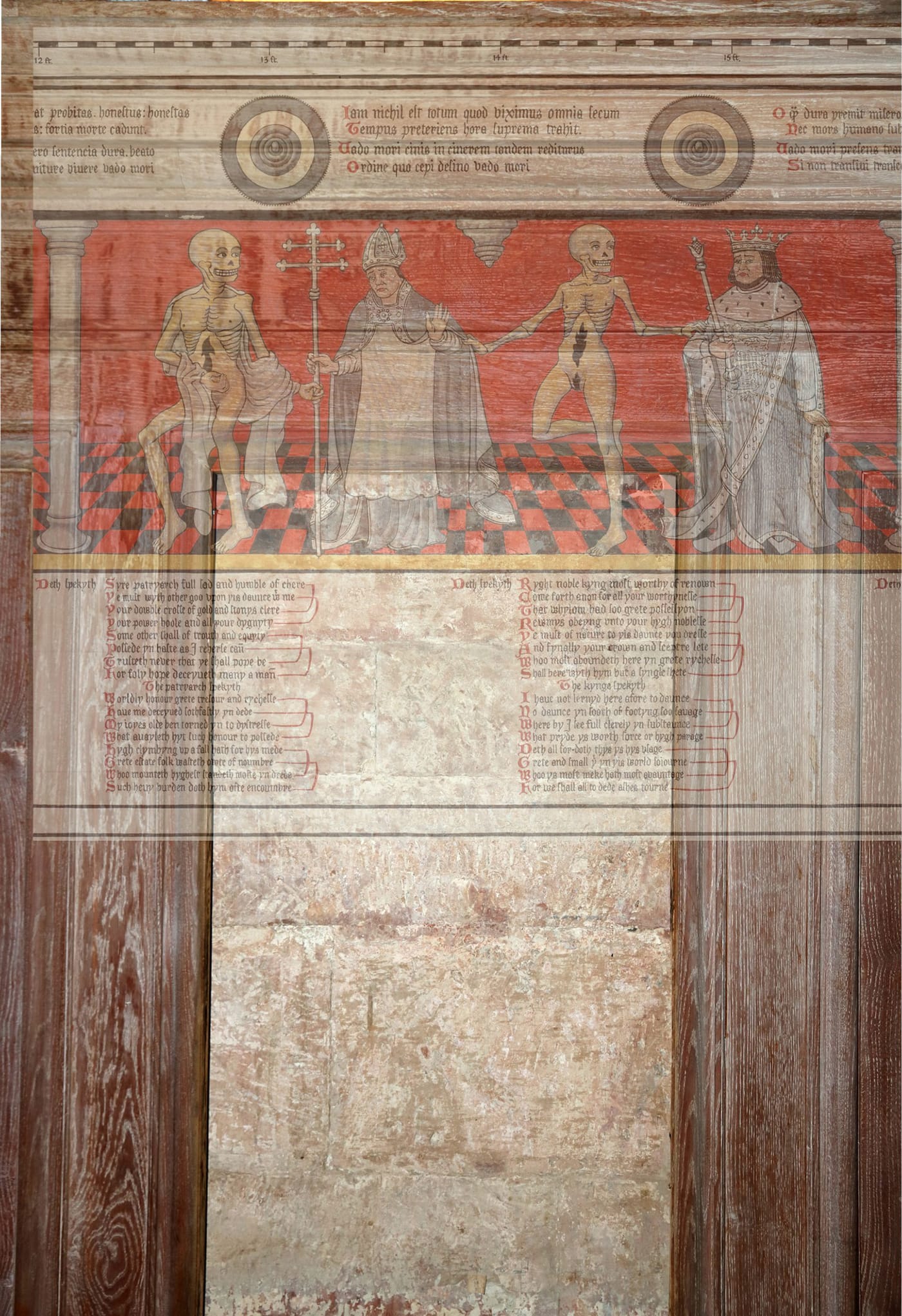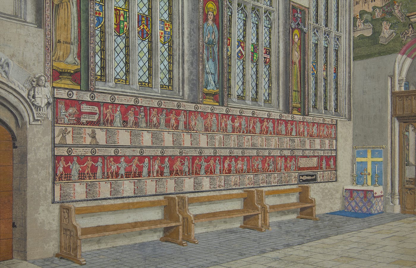 While removing the chapel’s wooden paneling, conservators also came across fragments of two ornate paintings. These unexpected findings show scenes from the life of Adam as well as of a Dance of Death painting; although vaguely documented in historic records, they have not been visible since the 20th century. Rather than simply painting over them, hands had also actively scraped parts of the surfaces away. A glimpse of the Dance of Death, however, arrives thanks to the hands of Wilfrid Puddephat, the Art Master at a local school, who in the 1950s undertook a meticulous study of the Chapel’s artworks and recreated the Dance of Death in a colorful illustration.