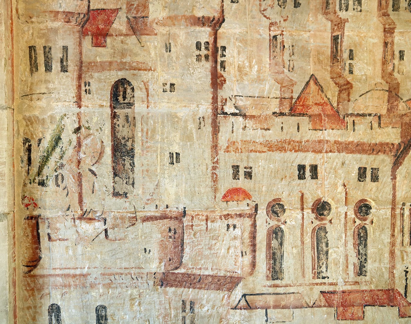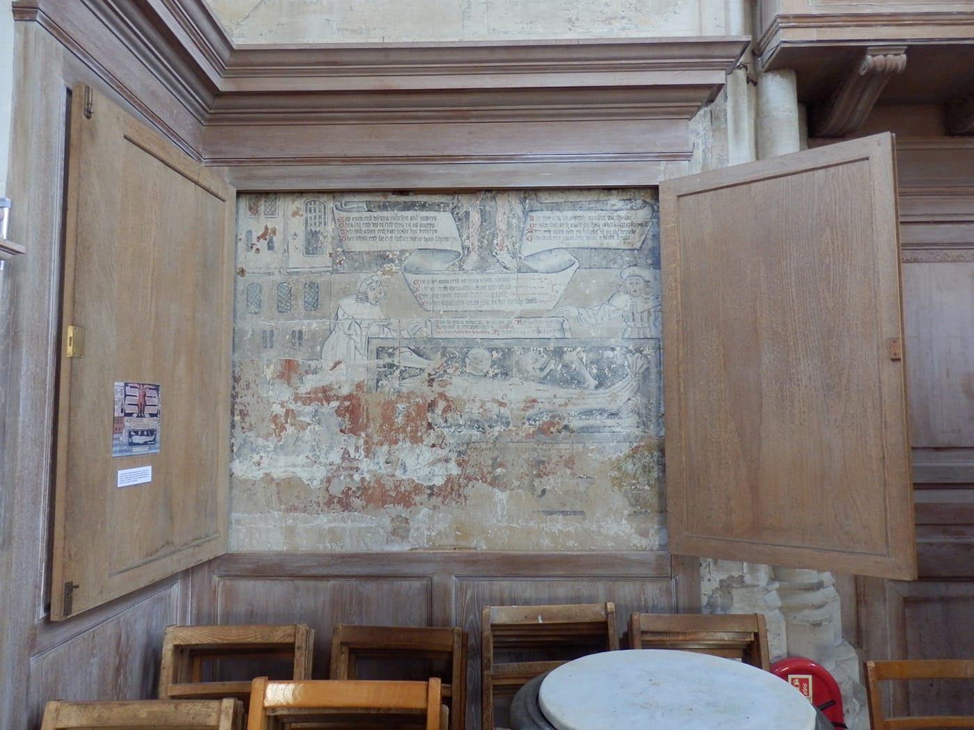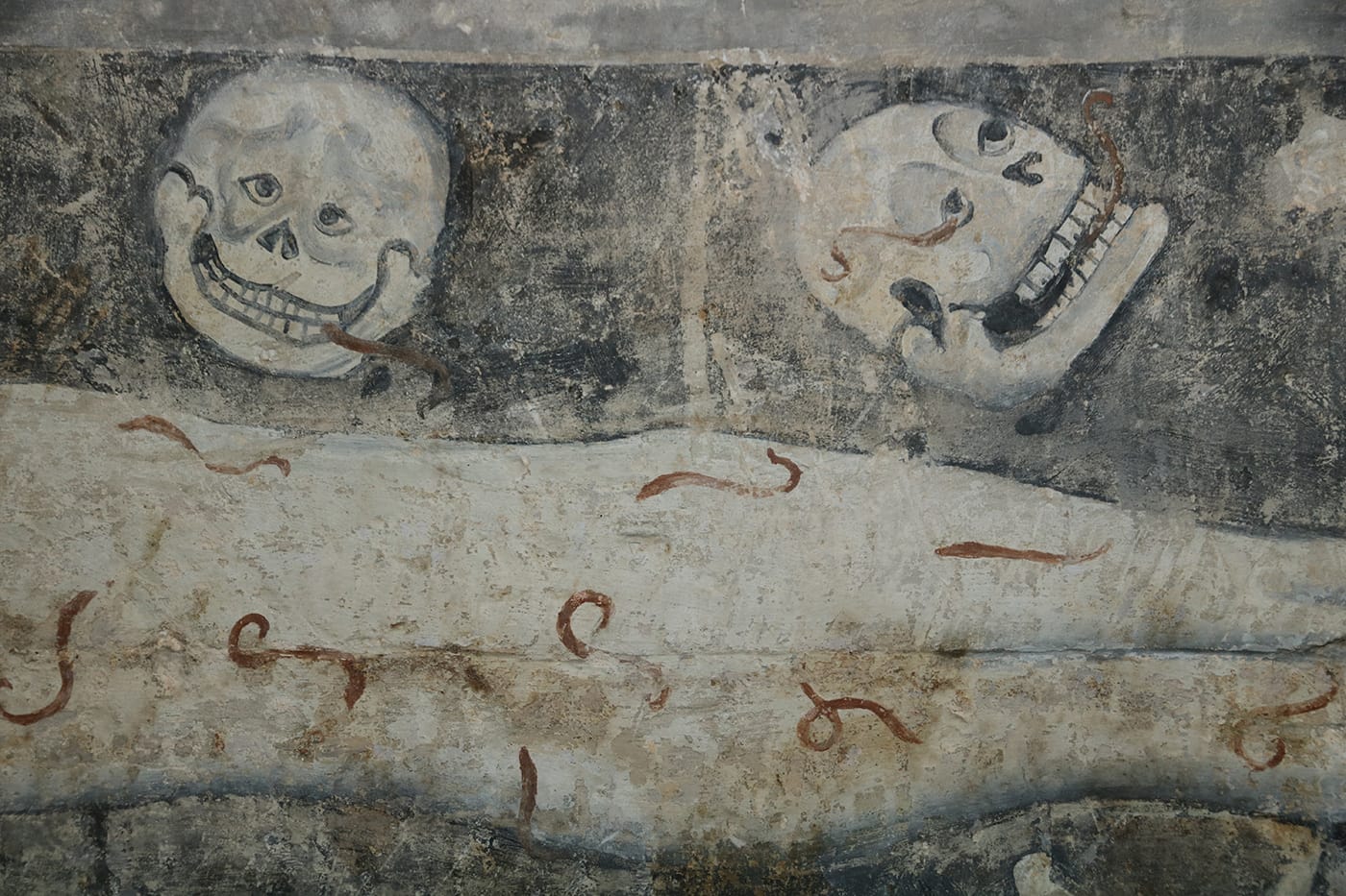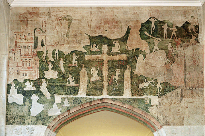 While removing the chapel’s wooden paneling, conservators also came across fragments of two ornate paintings. These unexpected findings show scenes from the life of Adam as well as of a Dance of Death painting; although vaguely documented in historic records, they have not been visible since the 20th century. Rather than simply painting over them, hands had also actively scraped parts of the surfaces away. A glimpse of the Dance of Death, however, arrives thanks to the hands of Wilfrid Puddephat, the Art Master at a local school, who in the 1950s undertook a meticulous study of the Chapel’s artworks and recreated the Dance of Death in a colorful illustration.