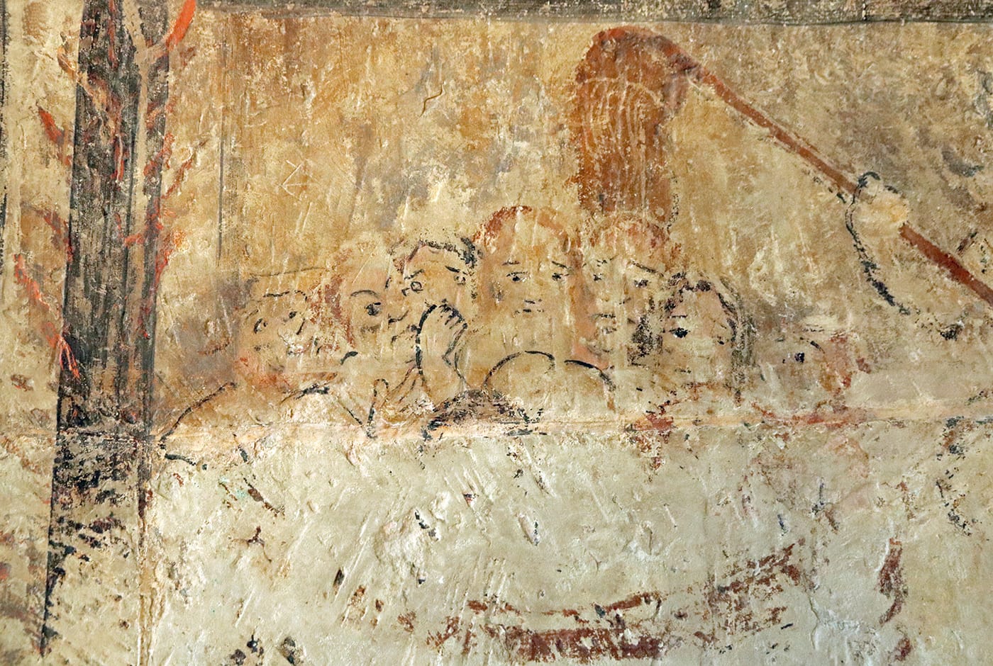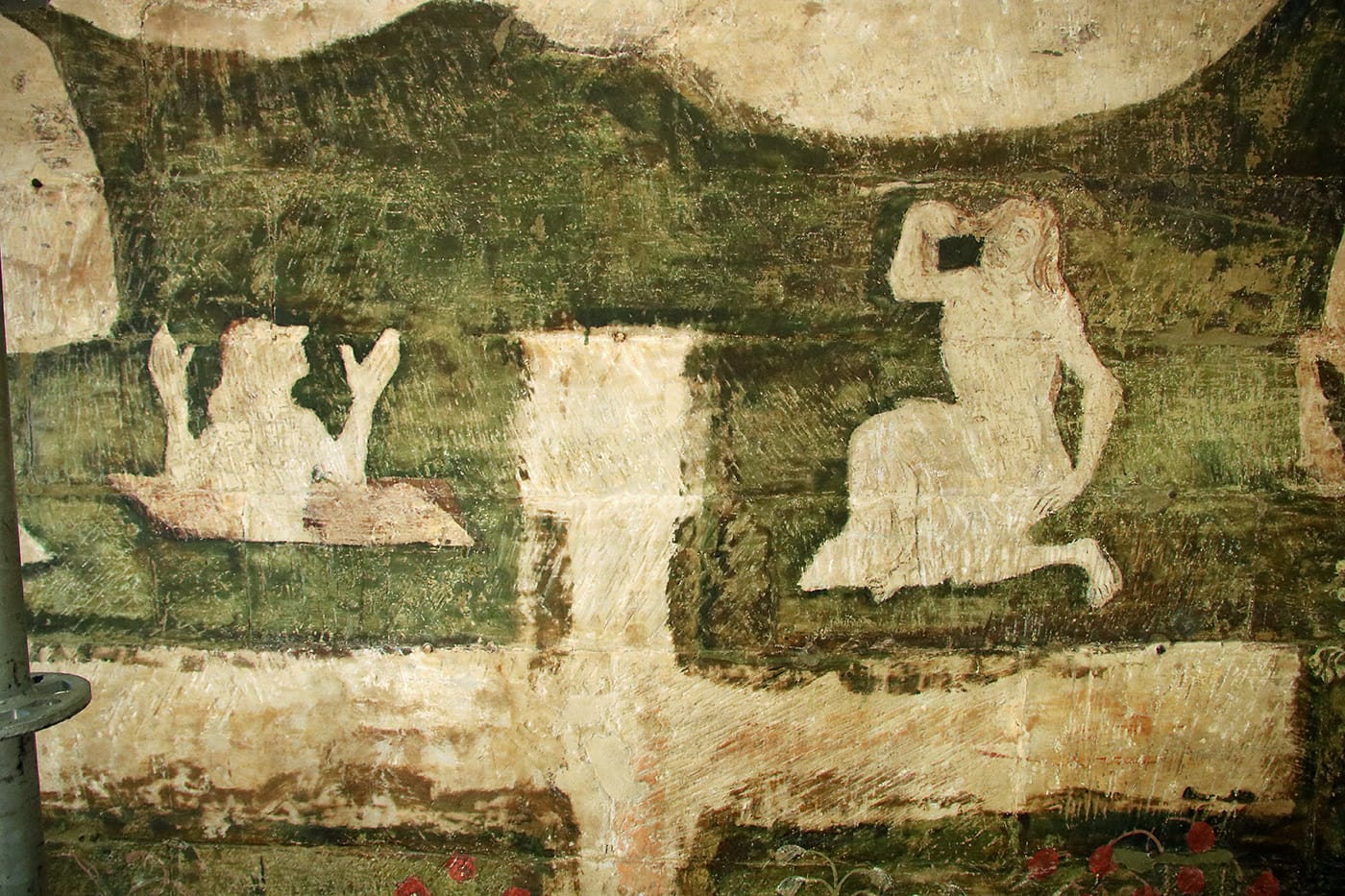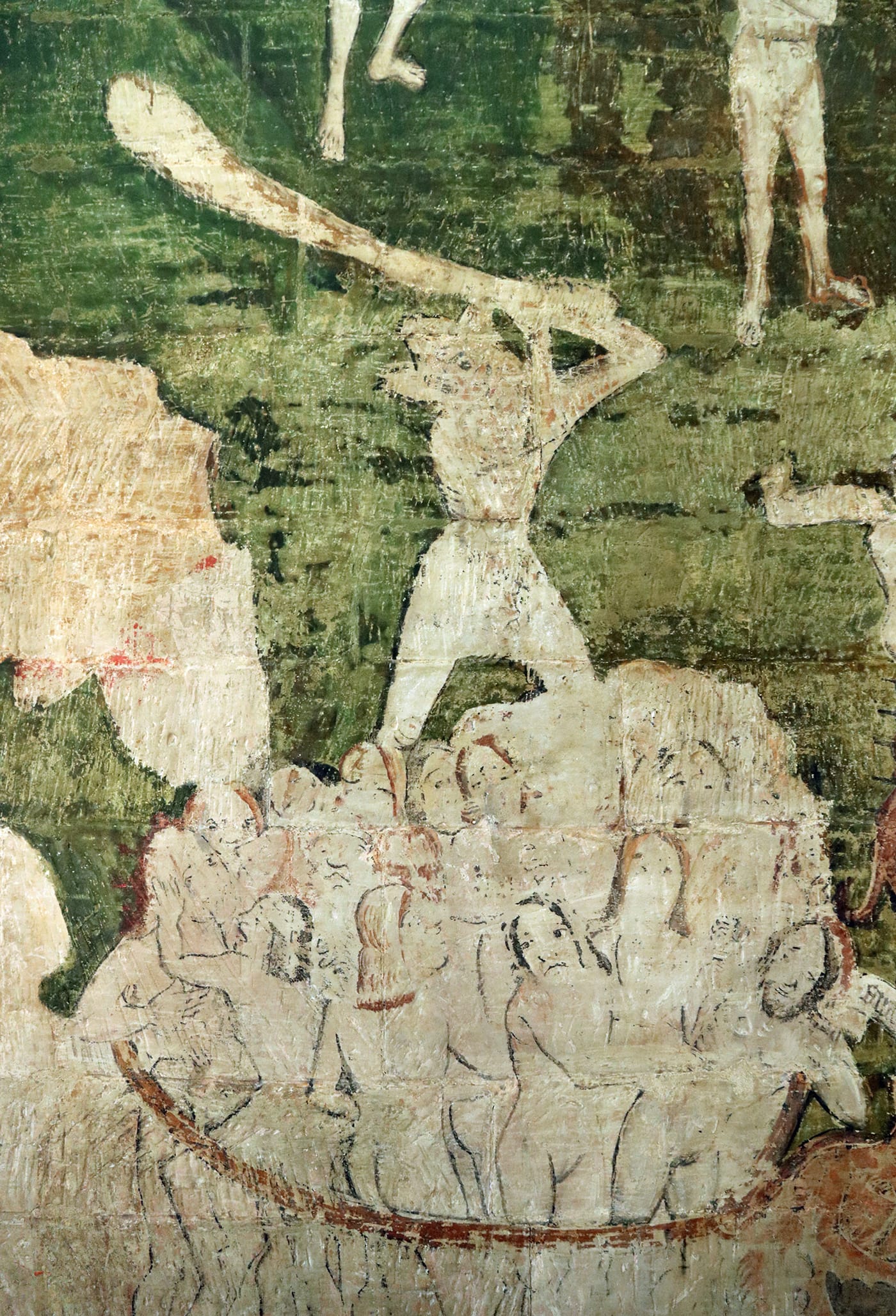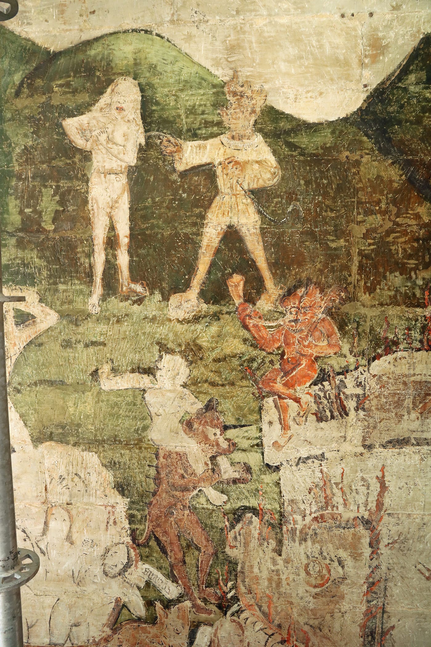 While “Allegory on Death” was in relatively stable condition, “the Doom” suffered much more damage, largely from a wax preservative applied to it in the early 20th century, which discolored the paint and also absorbed dirt. Paint had flaked off in many areas — a number of figures who have entered Heaven are unrecoverable — but the surviving scenes present a message clearly meant to warn of sinners on Earth. The scene includes people tied up and fed into the mouth of a fanged serpent, symbolizing the mouth of Hell, and depictions of demons torturing souls.