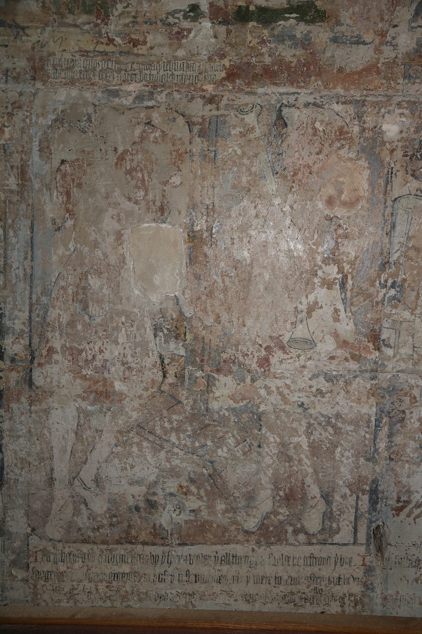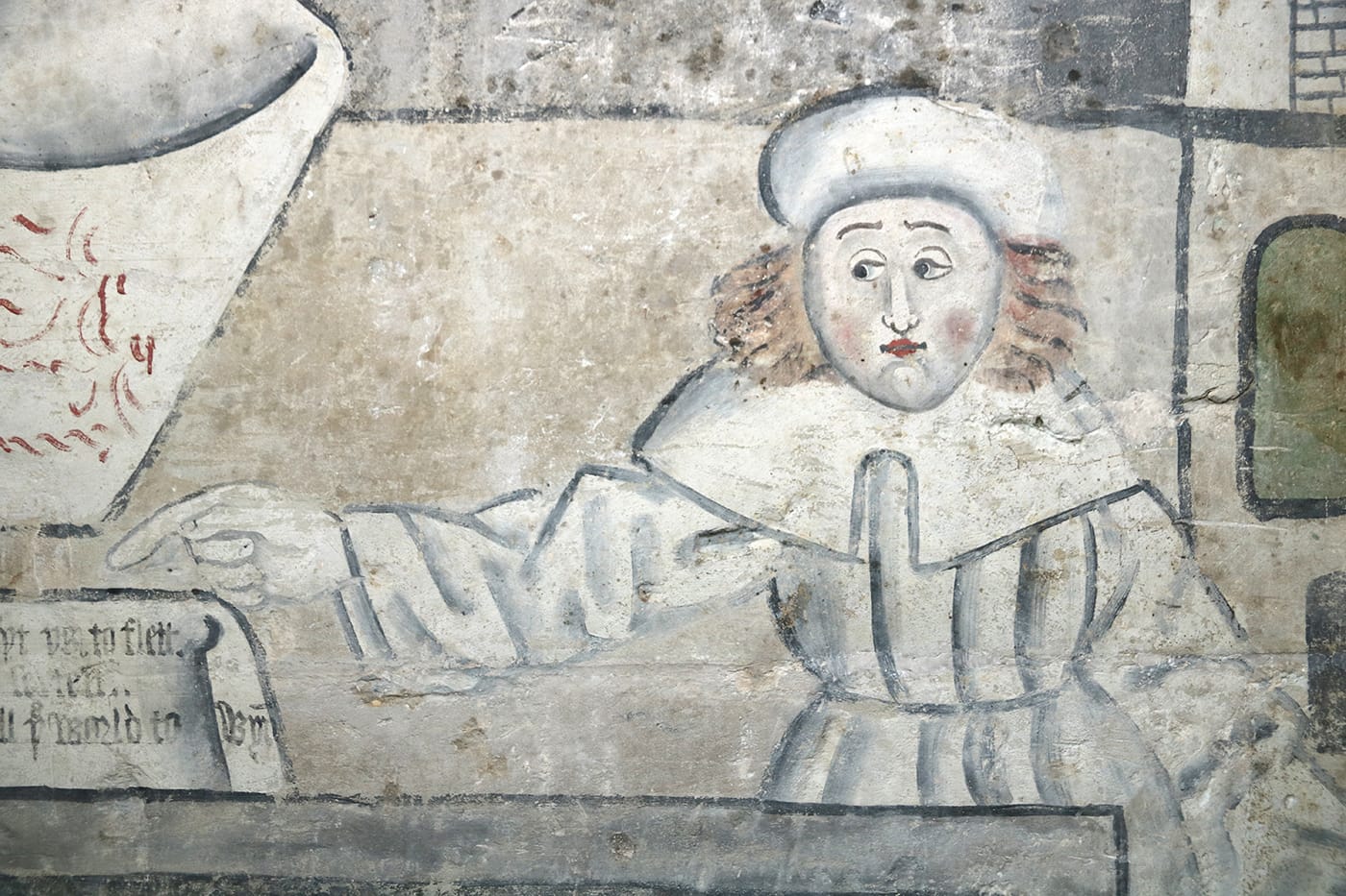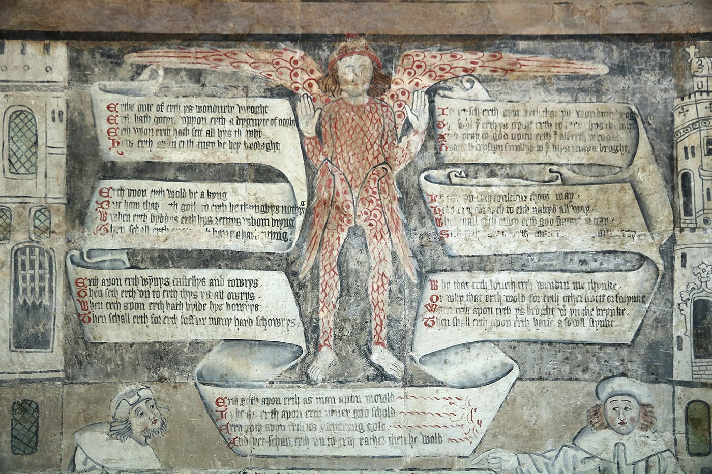 Conservators focused on two paintings: “the Doom,” which portrays the Judgement, is spread above the chancel arch; and “Allegory on Death,” a medieval memento mori, which was painted on a western wall. The latter likely shows a family crypt — complete with a body in a coffin, feasted on by wriggling worms — and was at one point also covered by timber paneling. St. Michael looms above the scene, surrounded by seven stanzas of verse; according to Statham, only his face showed evidence of defacement, suggesting that this death-related iconography may not have been deemed as offensive as other pictures.