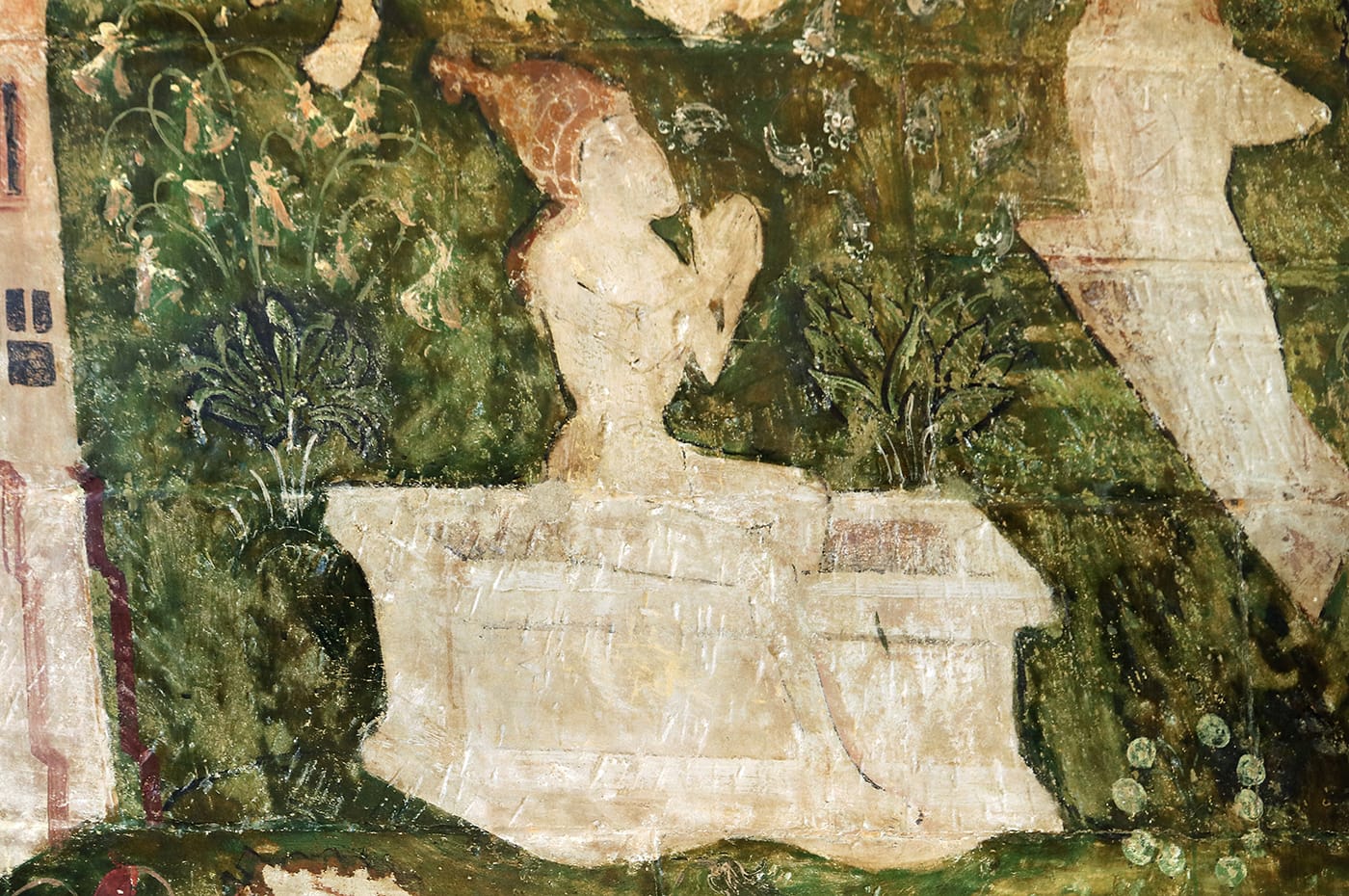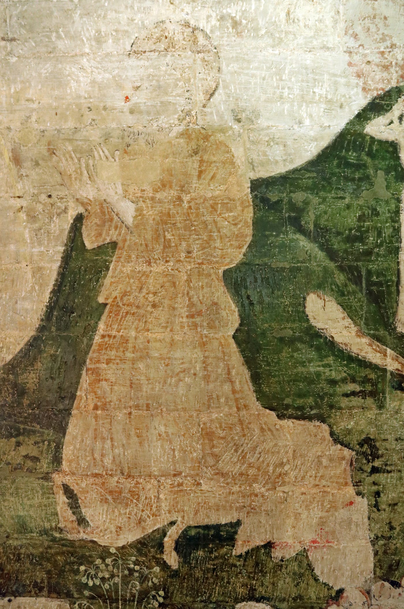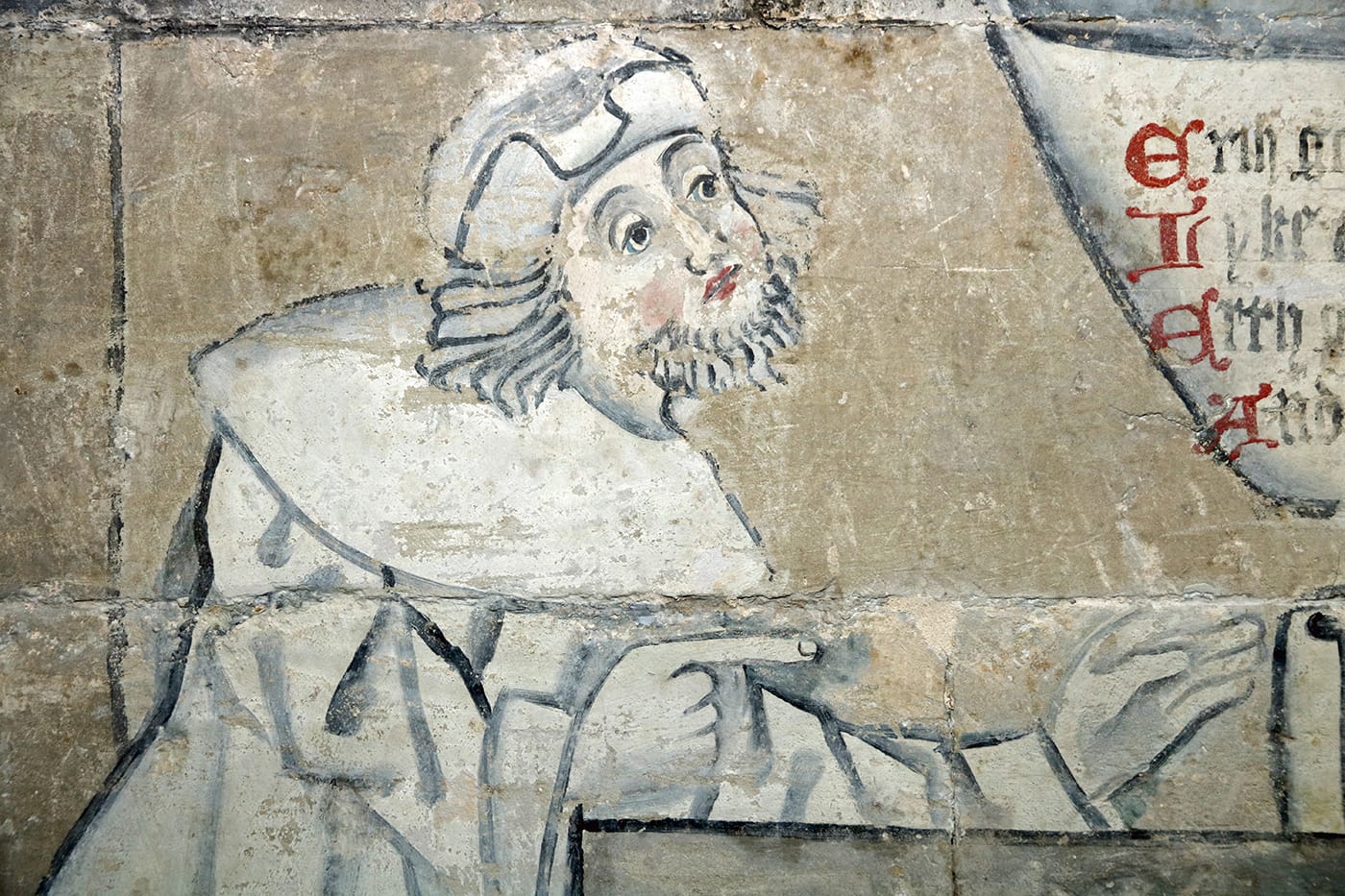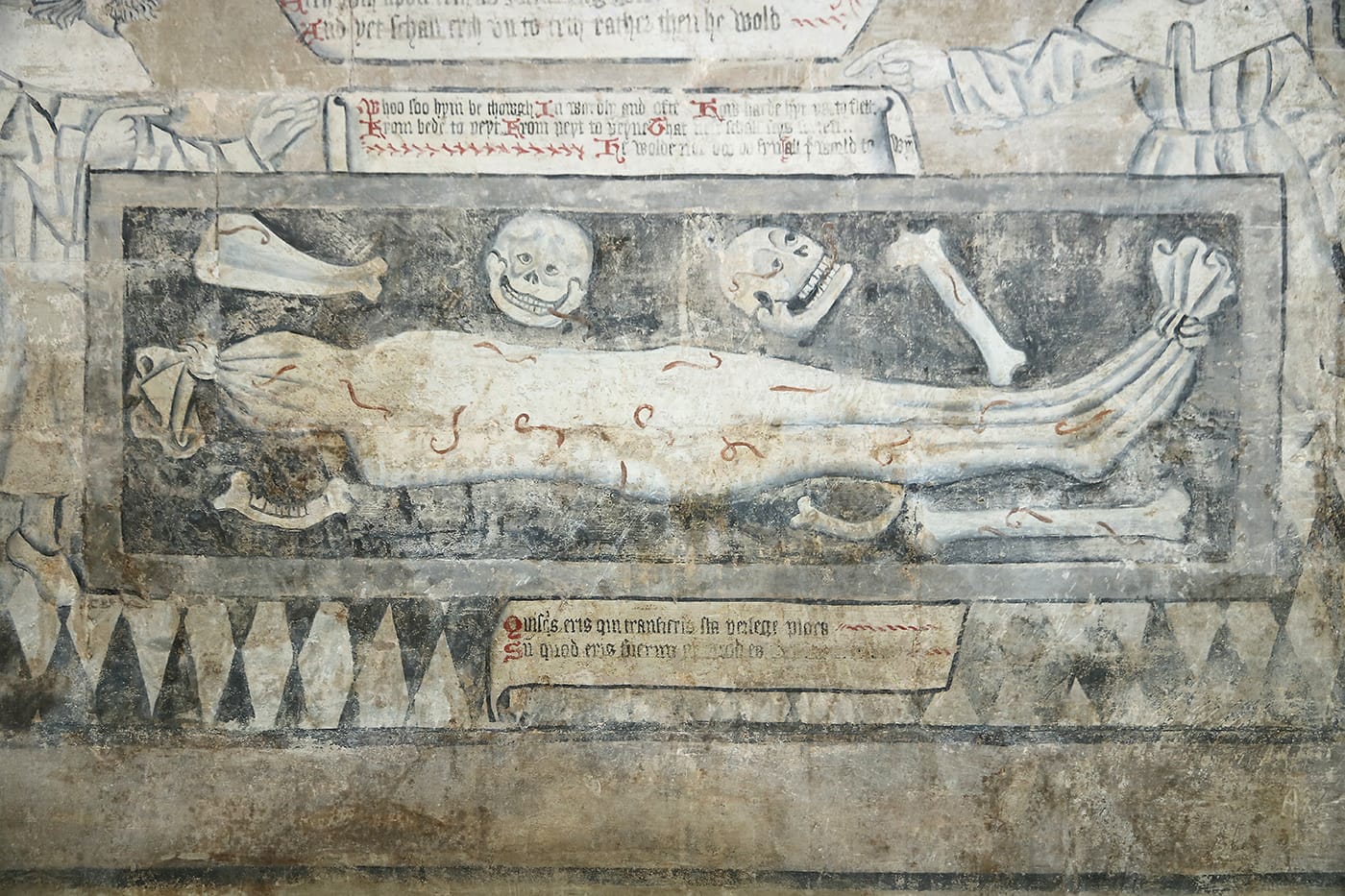 Conservators focused on two paintings: “the Doom,” which portrays the Judgement, is spread above the chancel arch; and “Allegory on Death,” a medieval memento mori, which was painted on a western wall. The latter likely shows a family crypt — complete with a body in a coffin, feasted on by wriggling worms — and was at one point also covered by timber paneling. St. Michael looms above the scene, surrounded by seven stanzas of verse; according to Statham, only his face showed evidence of defacement, suggesting that this death-related iconography may not have been deemed as offensive as other pictures.