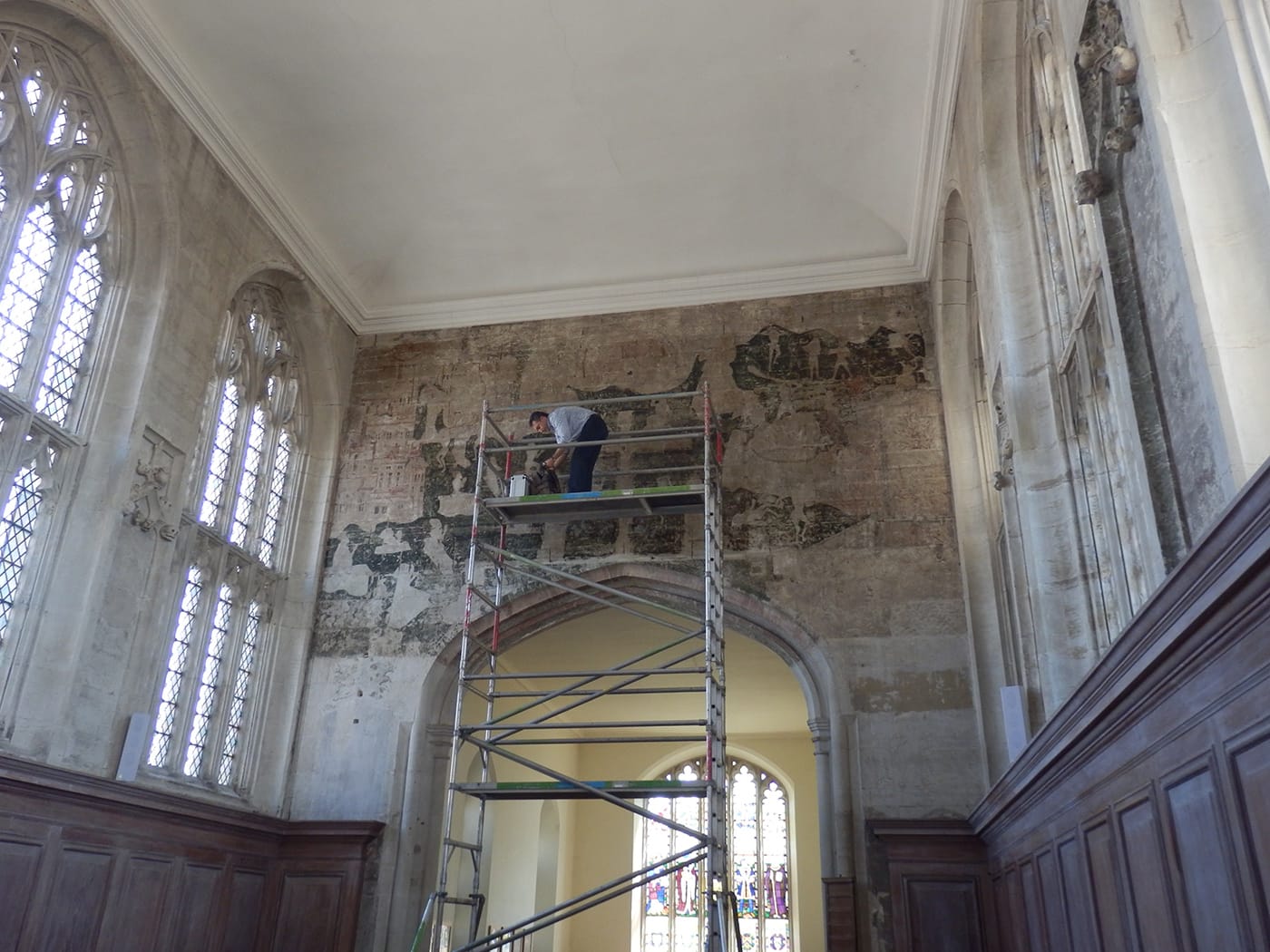 “The Chapel would not have been unusual in having some paintings or decoration,” Cate Statham, a project manager for Hawkes Edwards & Cave Conservation Architects, told Hyperallergic. “However, these were expensive undertakings, and the Chapel’s paintings are unusual and significant for several reasons. Firstly they were all carried out together, at the same time by the same artists — [they were] designed and executed as one piece of work. This is very rare indeed, and the stories told in the paintings also all interconnect — another unusual factor. The fact that most of this scheme still survives, albeit some of it in better condition than others, is incredibly rare … it is one of only a few buildings in Europe.”