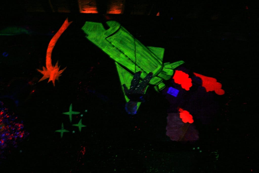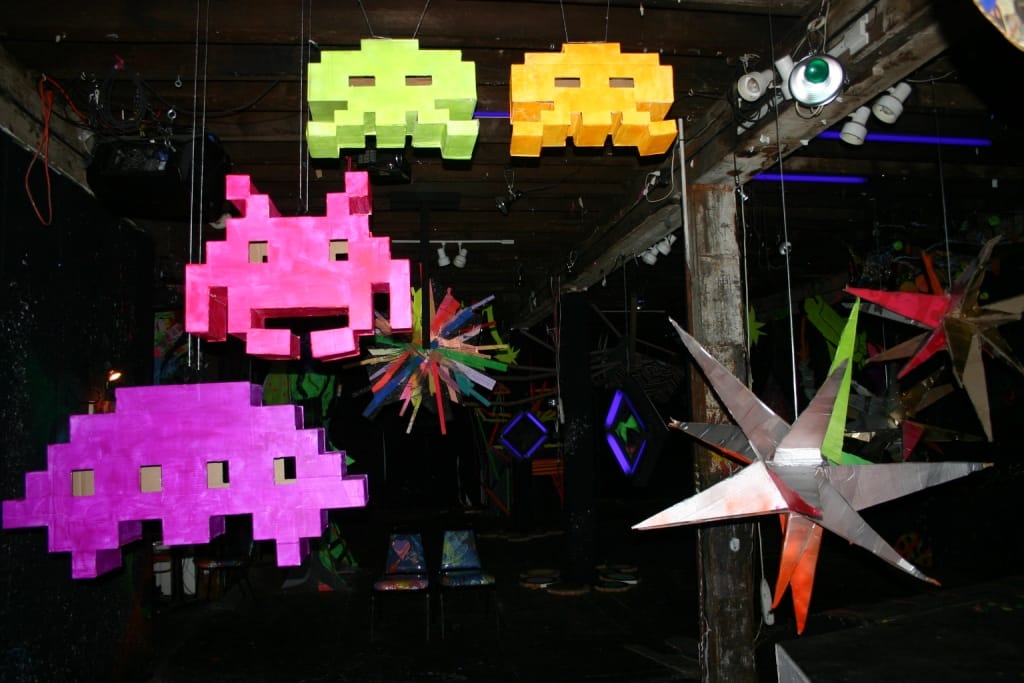 After the artist departed, Erik turned to me as if to say “and this is why I can’t give you a list of all the participants.” The show itself is a massive, darkly lit cavern, full of humming, beeping sound installation and gigantic pyschedilic neon sculpture. Neon space invaders float next to bright geometric paintings and a rotating abstract construction by Maya Hayuk. All of this is bathed in hanging purple neon, interspersed with painting and collage ranging from youthful cartoon to freewheeling abstraction. The whole thing feels like a Child’s bedroom, if the child grew up, developed mystical powers, laser vision and smoked too much pot. In typical style, there are no wall labels, fact sheets or price list.