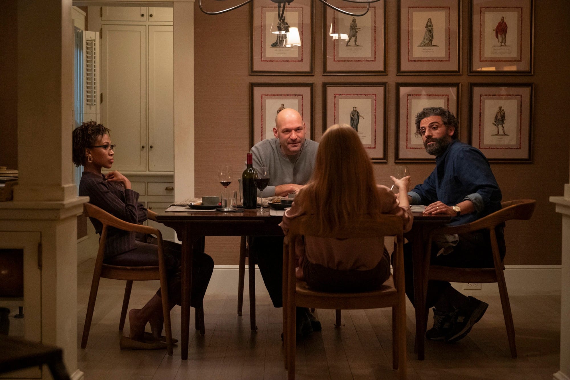 What works about this remake does largely because — and Levi deserves full credit for emphasizing rather than obstructing this —it is a dual-star vehicle, if a depressing one. Each episode begins (save one, which ends) with either Chastain or Isaac arriving on set, walking to their place for the first scene, and seamlessly transitioning from actor to character as the clapboard appears and an offscreen voice calls “Action!” There is little dialogue for other characters, and when asked to carry every sequence with only the other to help, Chastain and Isaac both offer performances free of the burdens that have plagued their respective celebrity personas. There is none of the didactic moralism of scripts unworthy of Chastain’s talents or the franchise-branding nonsense that’s plagued Isaac. Chastain is asked to be insecure and ungenerous (before a marvelously played reversal in the final episode), and Isaac to be confused and vulnerable. They bury these traits under so many fronts that recede and surface again and again, often within the same sequence, and in ways that make them as believable in love as in hate. It would be unfair to expect a remake of Scenes from a Marriage to match its emotional potency, but this nearly manages to.