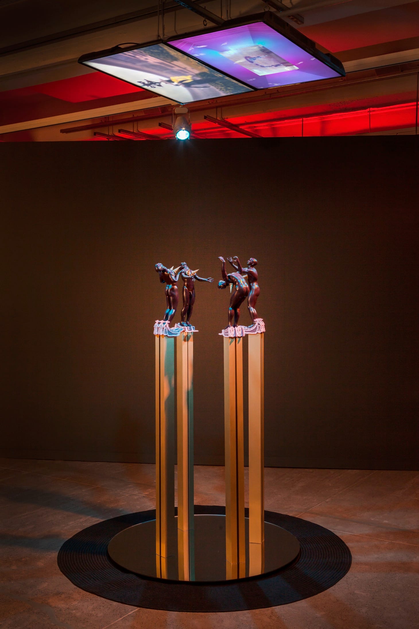 At one point in “Blessed Avenue,” a person peaks his head out from a Shanghai alleyway in the deep background to watch Satterwhite dance. A real head dangles, transfixed, enrapt. While much of the beauty in Satterwhite’s videos comes from their intricacy — figures twirling, flitting, and fucking within what feels like infinite scale — it’s nice to watch someone slow down. In another piece, Satterwhite suspends video screens from the ceiling above four black epoxy figurines with cone breasts wearing Patricia Satterwhite-designed shoes. Below a sky of screens, they’re paused mid-dance, mid-ritual, gazing euphorically upwards, maybe at the future. The piece’s title? “Room for Ascension.”