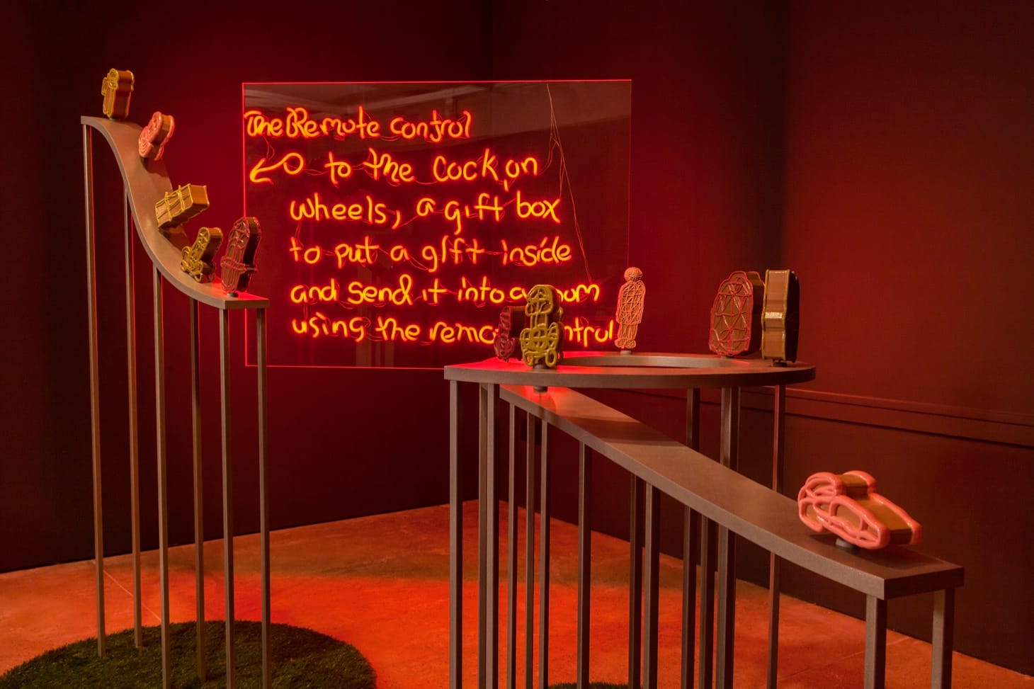 Each piece on the second floor combines sculpture with video except for “The Remote Control for Cocks on Wheels.” Here, Satterwhite has realized his mother’s as-seen-on-TV aspirations within his own nightclub aesthetic. Her squiggly pink, yellow, and green lines are filled with caramel brown epoxy resin and set atop three steel curving pedestals, confections parked on highway off ramps. Satterwhite has used all these institutional resources to make things that stay put. He now has an inventory, meaning he can’t just pick up and leave. Pressing the pause button on the remote control has allowed him to fully reach into his past and render his mother’s legacy. The room feels equally his and hers.