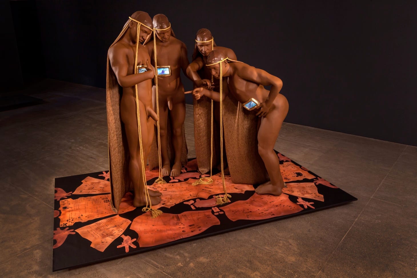 The museum’s second floor houses Satterwhite’s collaborations with the Fabric Workshop and Museum. As part of his two-year residence, he worked with FWM’s full-time artist employees to expand his practice to static objects. For instance, “Room for Doubt” reimagines Carvaggio’s 1603 painting, “The Incredulity of St. Thomas,” in which the famous non-believer dips a finger into Christ’s wound. In Satterwhite’s version, four life-size nudes mimic the poses of Jesus and company, their torsos containing small screens showing a performance in which Satterwhite grimaces as he drags his body across a floor. There’s no messiah or disciple here, only shared sacrifice. Stillness creates room to behold another’s pain.