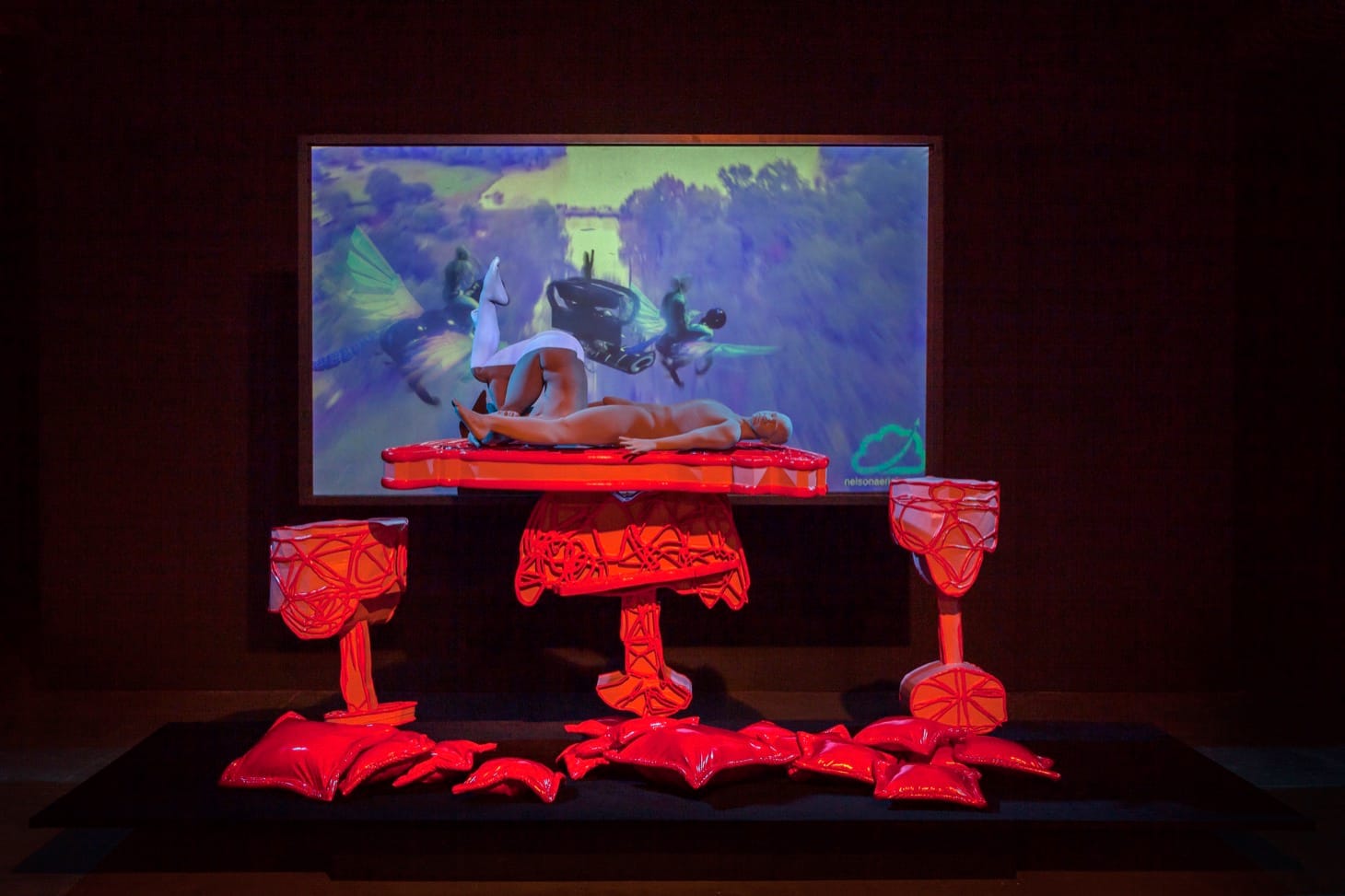 PHILADELPHIA — A flying machine flanked by winged horses soars over glaciers and flooded deltas. Like all great sci-fi objects, it strikes a balance between future and fantastical past, powered by nude men marching on a conveyer belt, spewing fire, and traveling faster than any present-day commercial jet. Jacolby Satterwhite doesn’t abide by contemporary rules of space and time. In “Blessed Avenue” (all works 2019), he leaps from Philly to Louisiana, from live action to animation, from sex party to Shanghai noodle bar in a single jump cut. Since almost a decade ago Satterwhite taught himself Maya — a 3D animation program that allows him to import video of himself and others into any landscape, any room — he hasn’t stopped moving. Or maybe his pace began before that.