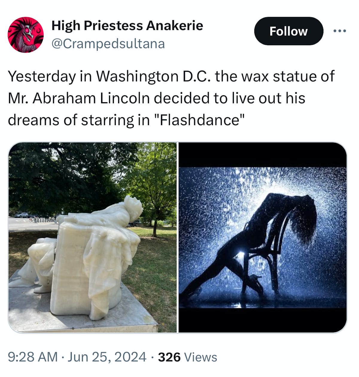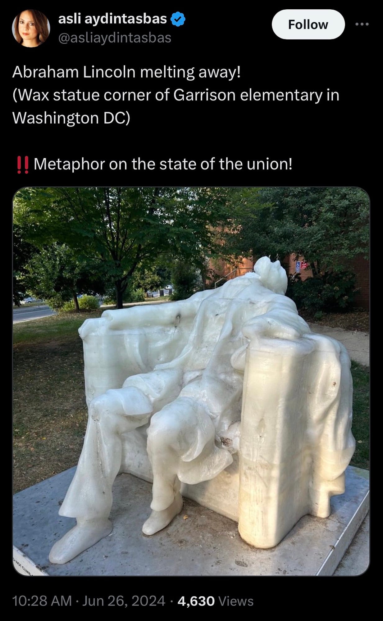 While Williams explained that sculpture was always meant to be “impermanent,” this past week’s extreme temperatures caused the wax effigy to melt away more rapidly than expected, resulting in some fairly humorous transformations — including an unintentional decapitation and the severance of Lincoln’s legs — that naturally caught the attention of users on social media.
